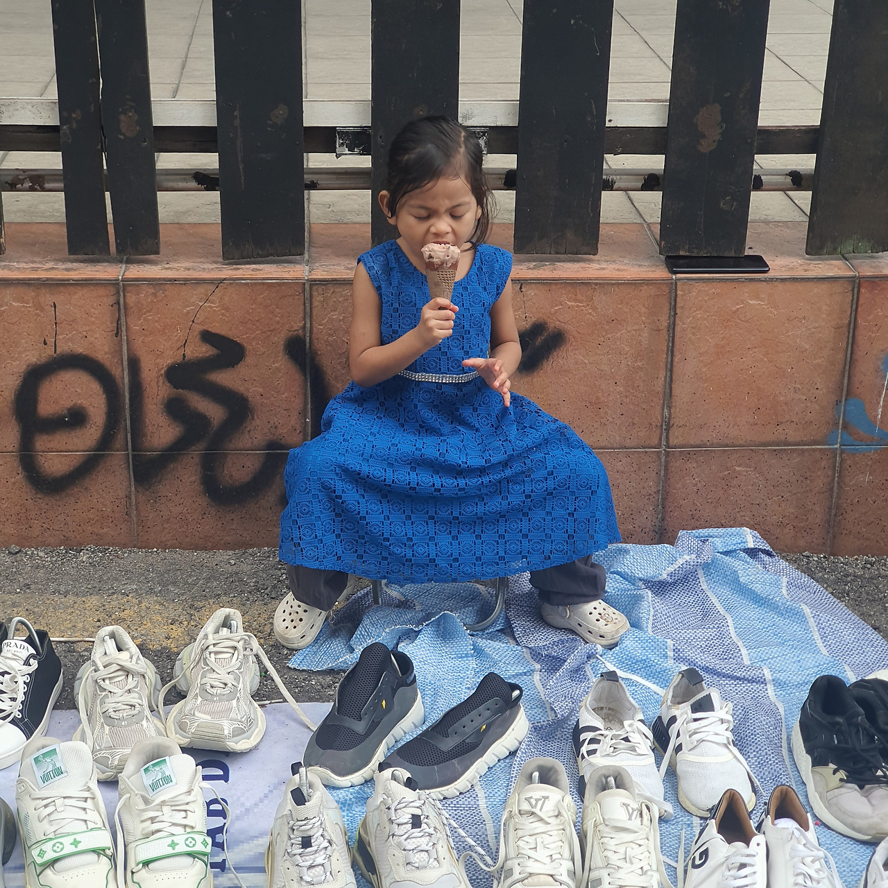 그러다, 신팔을 파는 할아버지의 손녀로 보이는 아이가 눈에 들어왔다. 이제 막 아이스크림 하나를 받아 든 아이는 겉 포장지를 뜯는데 집중하고 있었다.