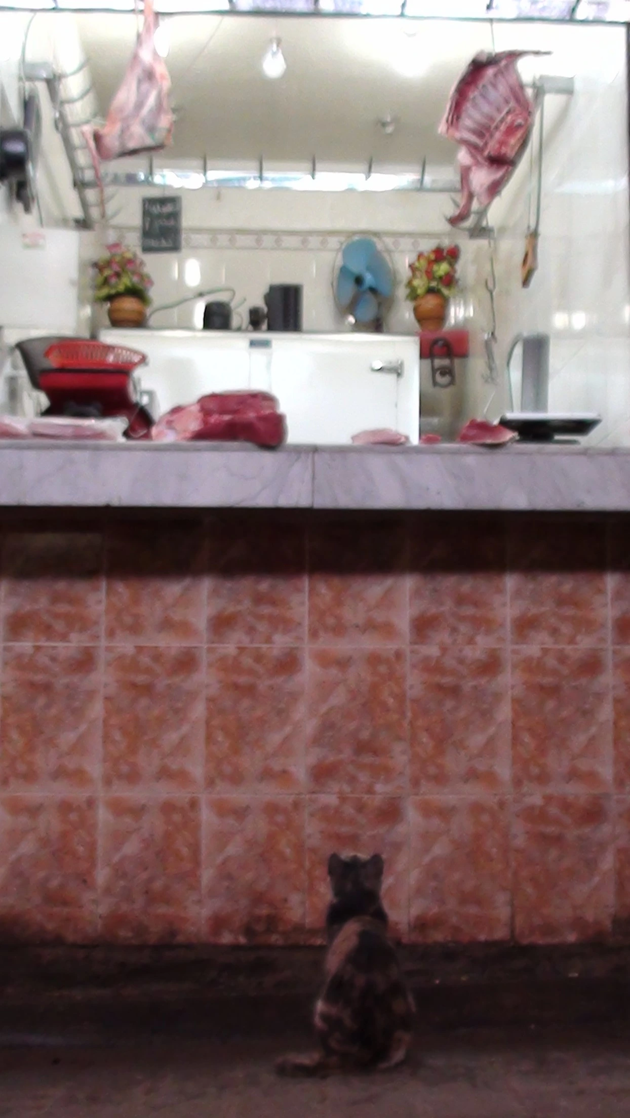 우연히 쇼츠 영상에서 고양이의 쥐 사냥을 본 적이 있었다. 냄새나는 하수구 앞에서 그 어떤 미동도 없다가, 고양이 특유의 동체시력과 민첩함으로 쥐를 사냥하는 모습은 수많은 영상 중에서도 그 기억이 생생하다. 그에 반해 사진 속 고양이는 목이 아파 보일 정도로 움직임 없이 고깃 덩어리만 쳐다보고 있었다.