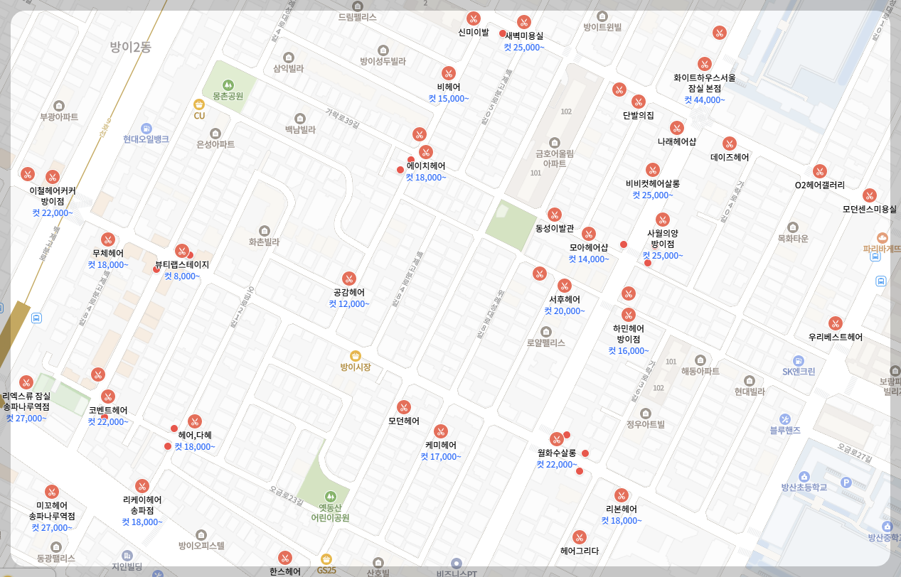 <집을 주변으로 미용실을 검색하니 수십곳이 검색 된다>