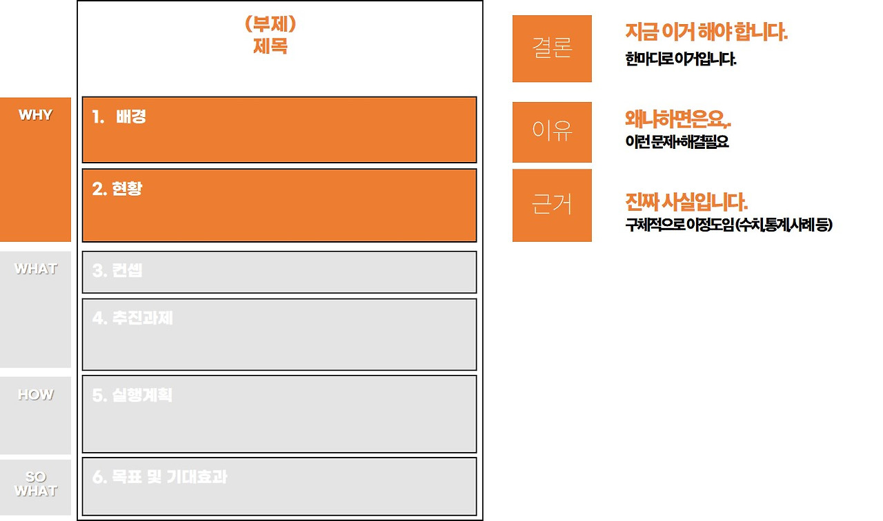기획서는 3초 게임이라는 말이 있습니다. 상대방이 3초 안에 기획서의 도입부를 보고 더 읽을지 말지 결정한다는 의미로, 그 만큼 기획서의 도입부가 중요하다는 뜻입니다. 기획서의 도입부는 고대 그리스 시절부터 통용 되어온 인류 최고의 설득술 [결론, 이유, 근거]의 순서로 구성하면 됩니다. 제목이 결론, 배경이 이유, 현황이 근거에 해당합니다. 먼저 기획의 핵심이자 가장 하고 싶은 말을 결론으로 제시하고, 배경은 결론을 뒷받침하고, 현황은 배경을 뒷받침 하는 3단논리로 구성하는 겁니다.