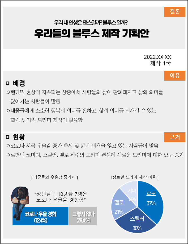 지금까지 내용을 1편에서 사례로 든 우리들의 블루스 제작 기획서에 적용해 보도록 하겠습니다.