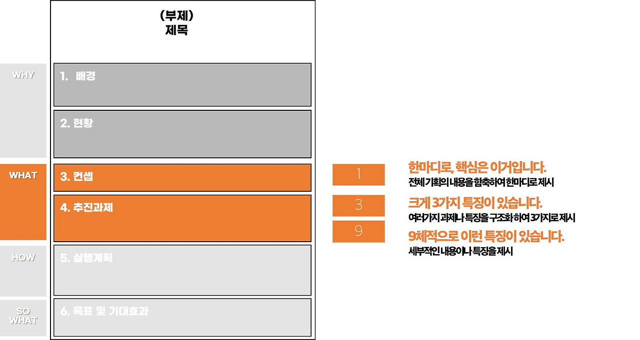 좋은 기획서의 본문에는 설득력 있는 구조가 있어야 합니다. 한마디(1)로 컨셉을 제시해서 강력한 메시지를 던지고, 여러가지 특징이나 과제를 3가지로 정리하며, 이를 다시 구(9)체화된 내용으로 전개하는 방법으로 일명 1-3-9 원칙을 적용하면 됩니다.