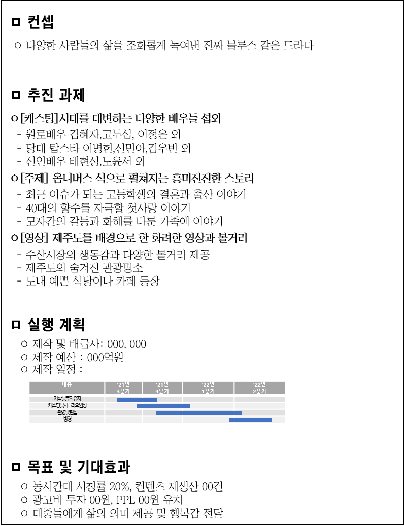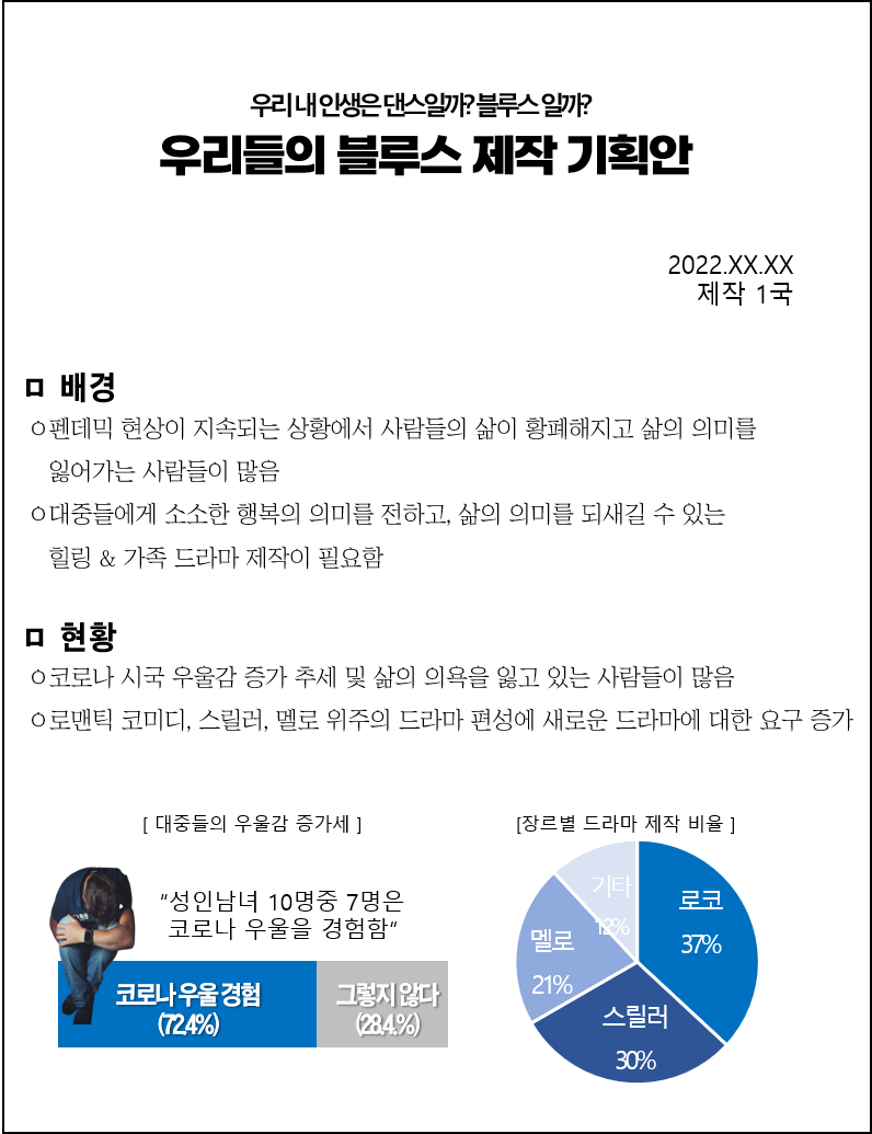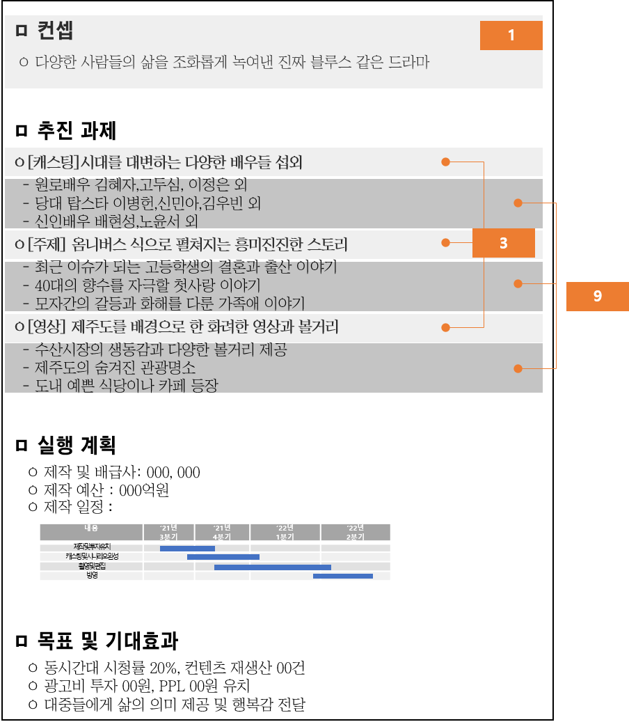지금까지 내용을 1편에서 사례로 든 우리들의 블루스 제작 기획서에 적용해 보도록 하겠습니다.
