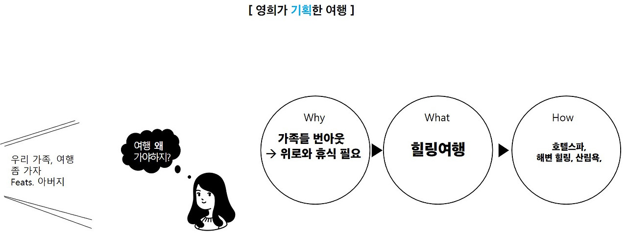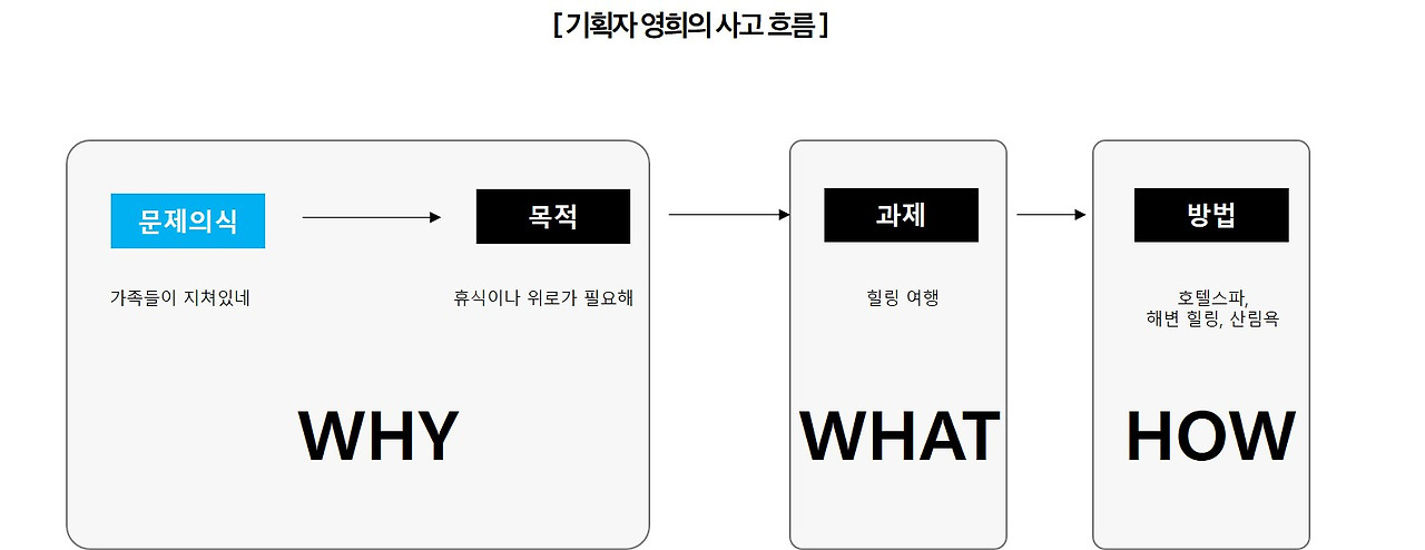 영희가 ‘왜 여행을 가야하지?’ 라는 질문을 통해서 휴식이나 위로가 필요하다는 목적을 느낀 것은 결국 가족들이 지쳐 있다는 문제를 발견했기 때문입니다. 문제의식이 있었기 때문에 휴식이나 위로의 필요성(목적)을 느꼈던 것이고 힐링 여행이라는 기획으로 연결할 수 있었던 것입니다.