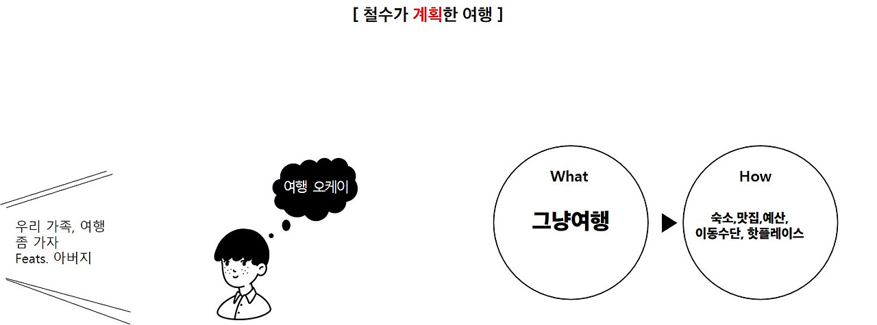 이미 정해진 What(가족여행)을 중심으로 이를 실행할 방안 How (숙소,예산,맛집) 등을 고민합니다. Why에 대한 고민을 생략한 채 What-How 로 생각을 전개해 나갑니다. 가족여행 계획이라고 할 수 있습니다.