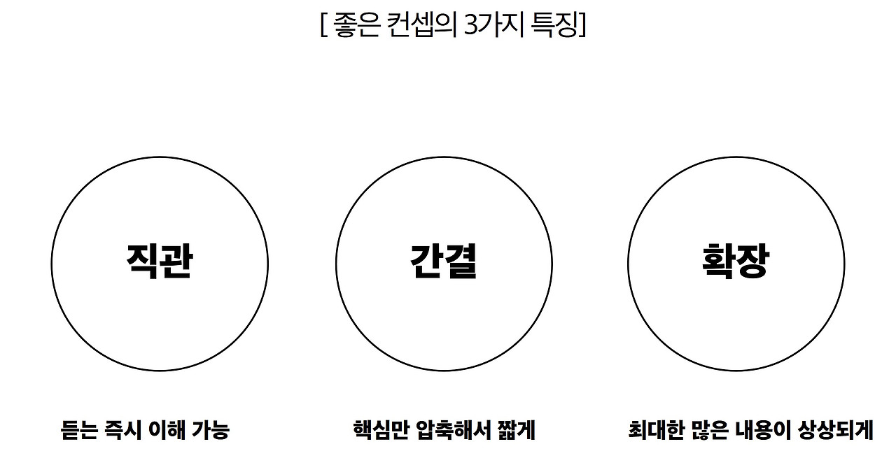 첫째, 들었을 때 바로 이해될 수 있게 명료해야 한다. 해석이 필요 없을 정도로 직관적이어야 한다. 둘째, 길고 장황하게 구구절절 말하는 것이 아니라, 핵심만 짧게 말해야 한다. 짜내고 짜내서 마지막에 남은 한마디나 한 줄을 컨셉으로 쓴다. 셋째, 컨셉을 듣는 순간 기획의 내용이 쫙 하고 펼쳐지는 확장성이 있어야 한다. 물에 잉크 한 방울을 떨어뜨리면 쫙 퍼지는 것처럼, 상대방의 뇌에 입력되었을 때 뇌세포를 타고 퍼지는 효과가 있어야 한다.