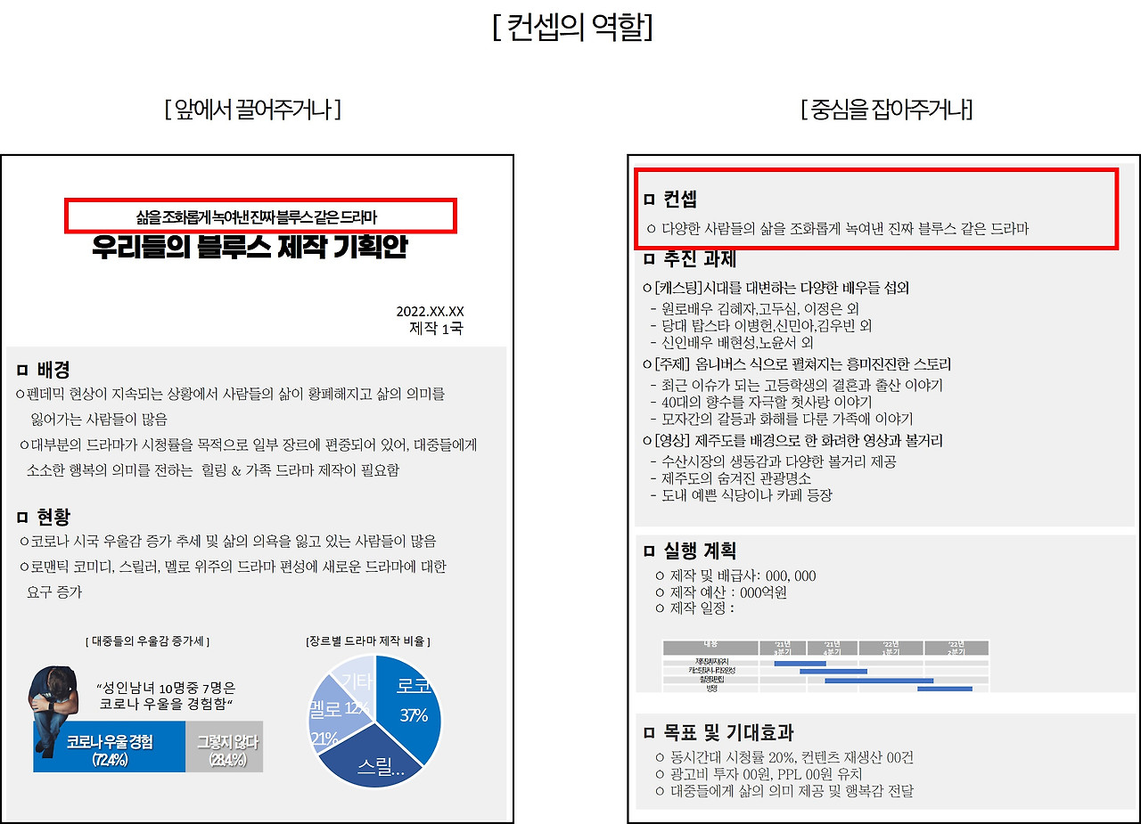 때론 컨셉이 앞으로 튀어나가서 전체 기획서를 이끄는 역할을 하기도 한다. 결론부터 알고 싶은 상사의 갈증을 해소하기 위해 제목 부분에 부제 형식으로 컨셉을 추가하기도 한다. '우리들의 블루스 기획안'이라는 다소 밋밋한 제목에 생기가 돌며 기획서에서 말하고자 하는 핵심이 좀 더 분명하게 다가온다.