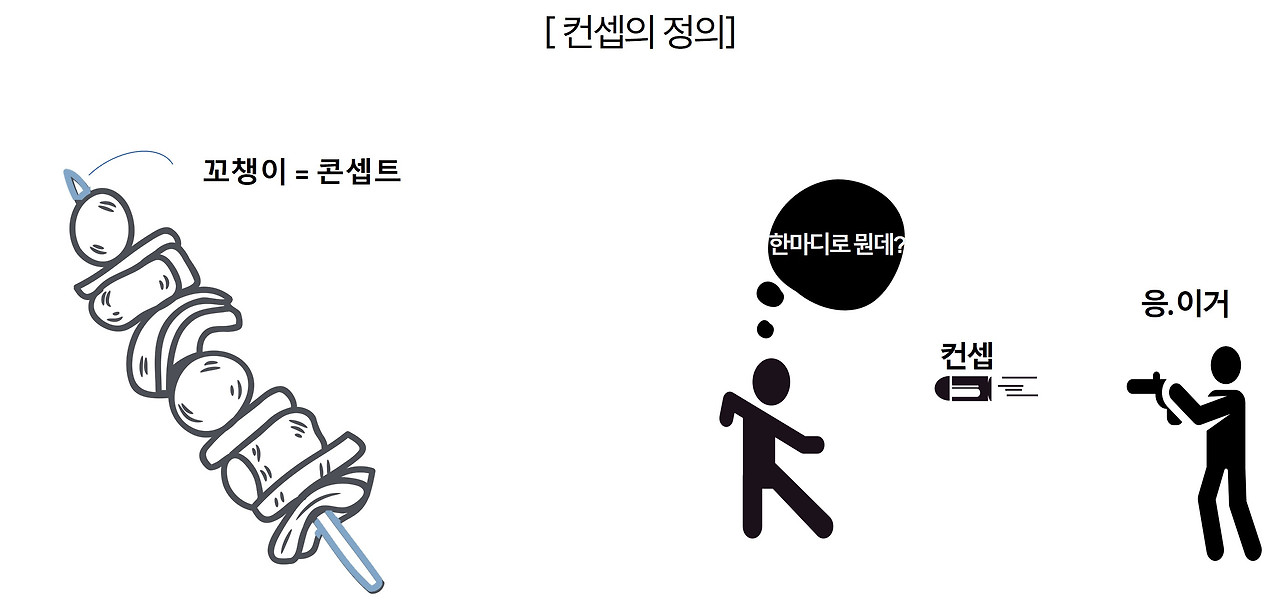 마치 우리가 맥주 안주로 즐겨먹는 꼬치의 내용물 삼겹살, 닭, 파, 양송이버섯, 토마토 등을 한방에 꽤는 꼬챙이처럼 내 기획의 내용을 응축한 한 마디라고 할 수 있다. 컨셉은 ‘한 마디로 뭔데?’ 라는 상사의 질문에 대한 답으로 쓰며, 기획의 해결책이나 특징을 압축적, 비유적, 시각적으로 제시한 간결한 한마디를 의미한다.