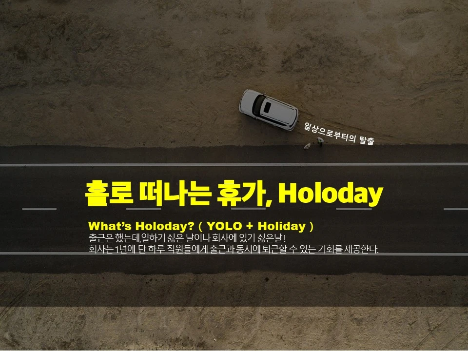 출근과 동시에 퇴근해서 문화체험을 하고 즐길 수 있도록 지원했던 프로그램의 컨셉으로 욜로와 할리데이를 결합하여 홀로데이로 컨셉을 제시함
