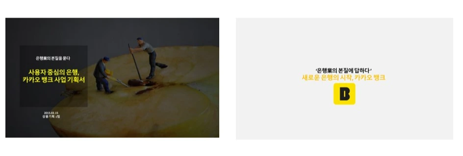 아래 기획서는 카카오 뱅크의 가상 기획서입니다. 제목에서 ‘은행업의 본질을 묻다’ 라고 쓰고, 전체 기획의 내용을 설명한 후 클로징 페이지에서 ‘은행업의 본질에 답하다’ 라는 표현을 썼습니다.