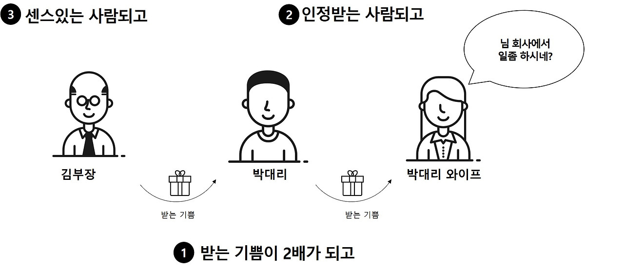 선물을 받은 박 대리 와이프는 생각지도 않은 선물을 득템 해서 기분이 좋고,선물을 전달한 박 대리도 기분이 좋다. 게다가 박 대리가 회사에서 인정받는 사람이거나 사회생활을 나쁘지 않게 한다라는 덤 효과까지 발생한다. 마지막으로 박 대리가 아닌 박 대리 와이프의 선물을 준비한 김 부장은 센스 있다는 평까지 들을 수 있으니, 이거야 말로 1타 3피의 신공이 아닐까?