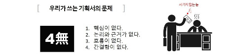 그런 경험이 반복되면서 소위 까이는 기획서의 특징에 대해서 정리해 볼 수 있었다. 내가 상사에게 들었던 피드백인 동시에 내가 후배들에게 해주었던 피드백이기도 하다. 이를 4가지 측면에서 정리해 보려고 한다. 상사가 내 기획서를 앞에 두고 하는 말을 토대로, 내 기획서가 까이는 4가지 이유에 대해서 이야기해본다. 소위 싸가지 없는 기획서에 대한 이야기이다.