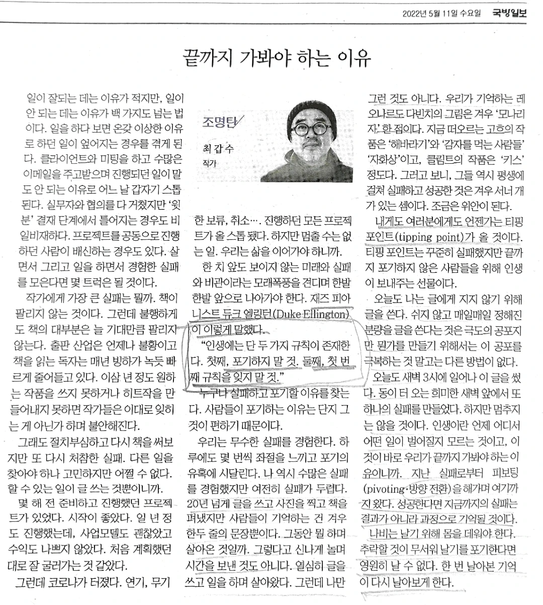 2022년 5월 11일자 국방일보를 펼쳤다. 18면에 칼럼이 있는데, 제목이 "끝까지 가봐야 하는 이유"다. 최갑수라는 작가분이 쓴 글이었다.