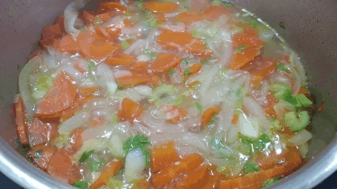 불린 통곡물을 옆에 두고 스테인리스 팬에 채 썰은 양파 반개를 넣고 올리브유에 약불로 볶는다. 팬에 향을 입히고 양파의 풍미를 올려주는 올리브유는 반 숟갈이면 충분하다. 양파가 진득하게 익어 갈변하기 시작할 즈음 물을 붓는다. 양파가 갈변할수록 육수의 색은 탁해지므로 기호에 맞에 타협점을 찾는게 포인트다. 물의 양은 2인분 기준으로 호가든 맥주컵 두 잔(900ml)이다. 이때 다시마를 손바닥 반만큼 넣어 감칠맛과 바다향을 첨가해 준다. 찬물이 끓는 동안 나머지 재료를 모두 깍두기 크기로 썰어놓고 물이 끓면 바로 넣을 준비를 한다. 채소 수프의 가장 큰 원칙은 재철 채소를 넣는 것이다. 재철 채소는 그 계절의 해와 바람과 땅의 기운을 충분히 받고 자라나 영양이 풍부한 데다가 마트에서 제일 신선하고 저렴한 채소들이기도 하다. 겨울엔 재철 채소가 드물다. 대신 상대적으로 따뜻한 남부지방에서 배추, 양배추, 무, 홍당무, 단호박 등을 재배하고 저장해 판다. 이번 겨울 채소 수프에는 양배추와 무, 홍당무와 브로콜리, 샐러리를 선택해 깍둑 썰었다.