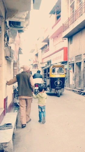 손자의 손을 잡고 걸어가는 할아버지의 뒷모습.