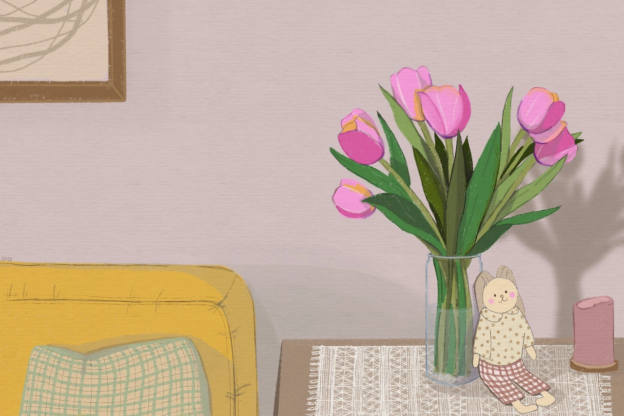집으로 돌아와 거실 한편에 분홍빛 튤립을 올려두었다.