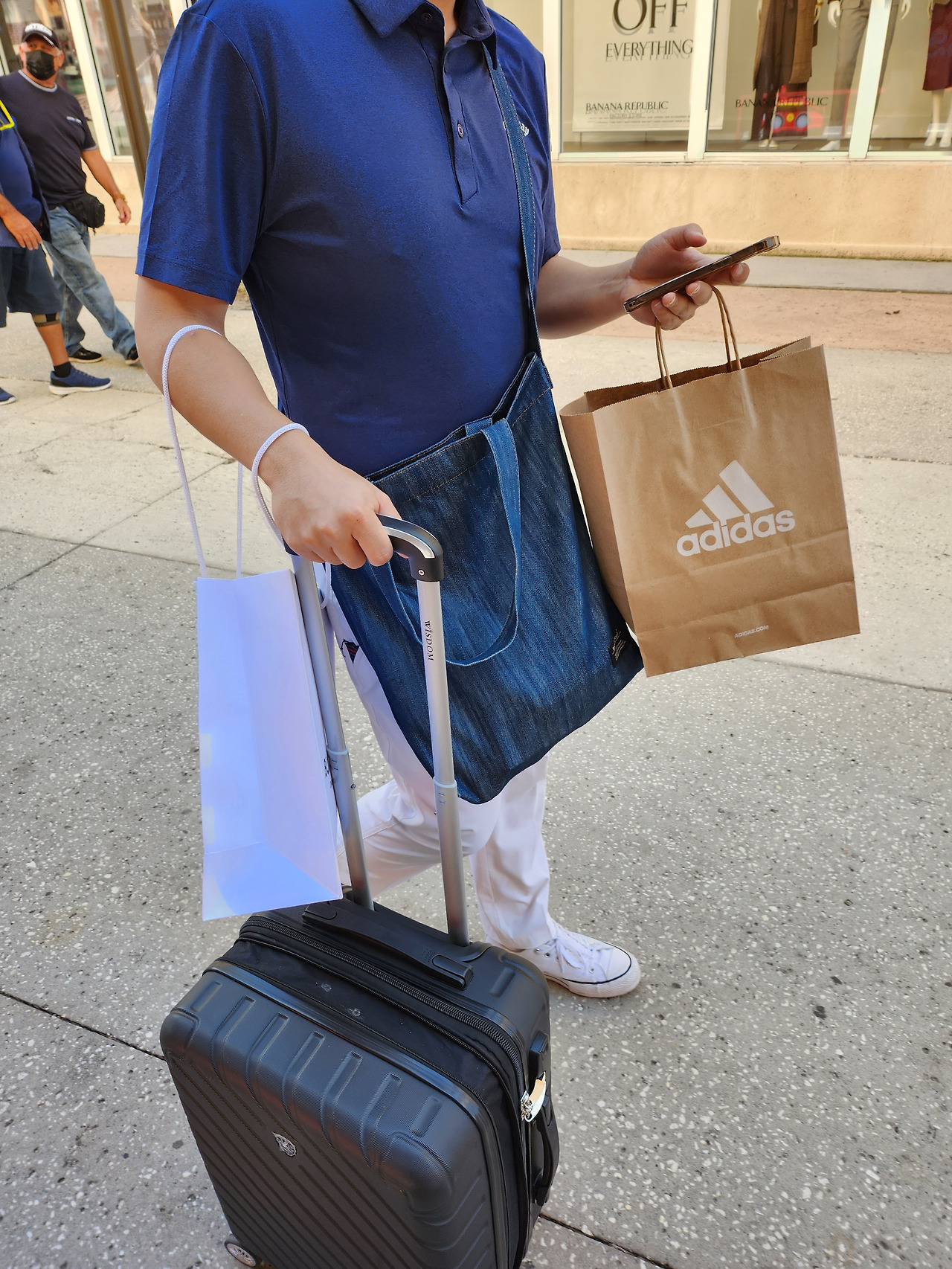 우리는 잔뜩 구매한 쇼핑백과 새로 산 캐리어를 들고