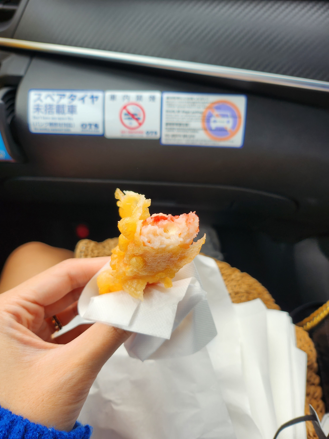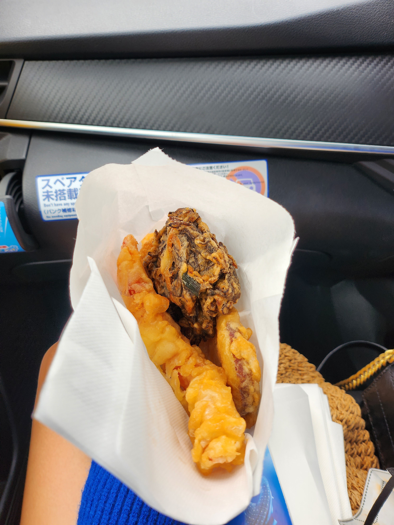 오징어와 고구마, 게살, 해조류 등 갓 나온 튀김들을 봉지에 담아 담아~ 차에 들어와 한입 베어 물은 그 순간!