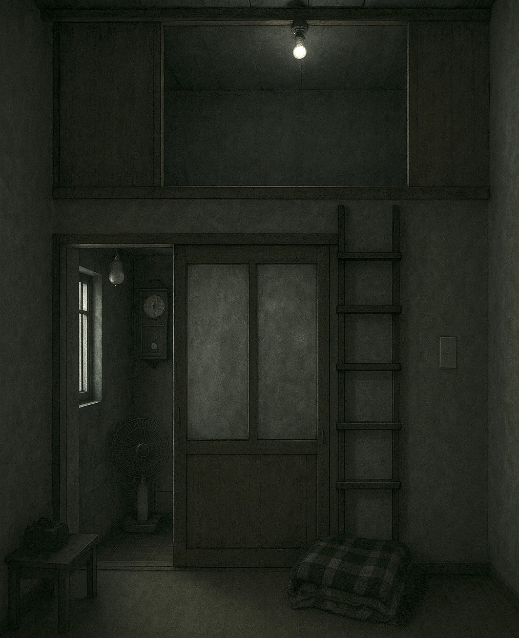 낡은 단칸방 앞, 무겁게 닫힌 문을 사이에 두고