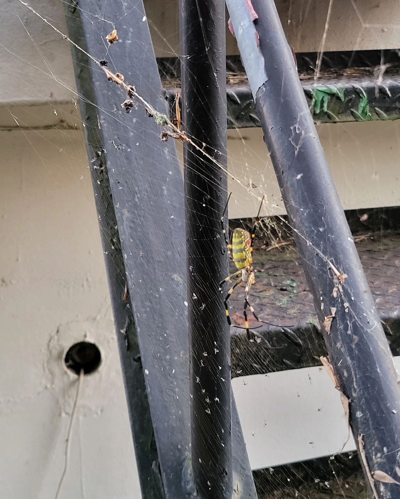 옥상으로 올라가는 철제 계단은 집 뒤의 대밭과 붙어 있습니다. 거미들의 사냥터지요.