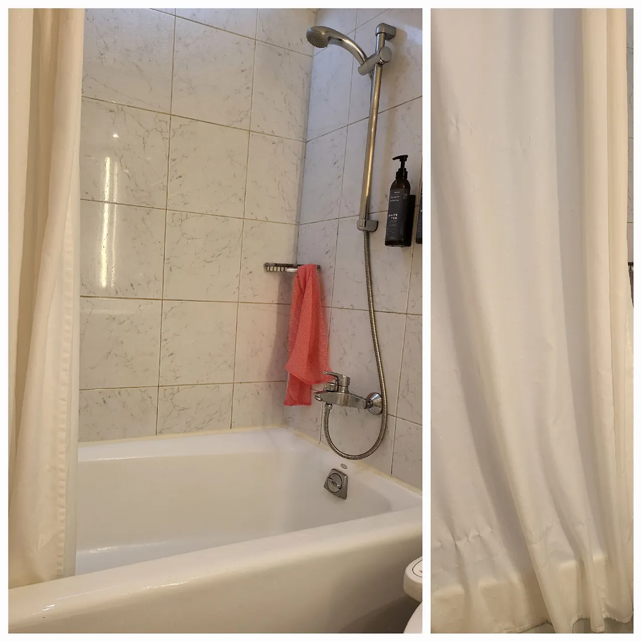 특급호텔이라도 오래된 호텔은 화장실이 좁고 사진처럼 방수커텐이 있습니다. 보통 한국의 신축 호텔은 샤워실이 유리로 분리되어 있다보니 많은 사람들이 방수커텐을 잘 쓰지 못합니다. 방수커텐을 왼쪽처럼 안으로 치면 물이 자연스럽게 욕조 안으로 떨어지죠. 반면 오른쪽처럼 밖으로 치면 물이 바닥에 고이죠.