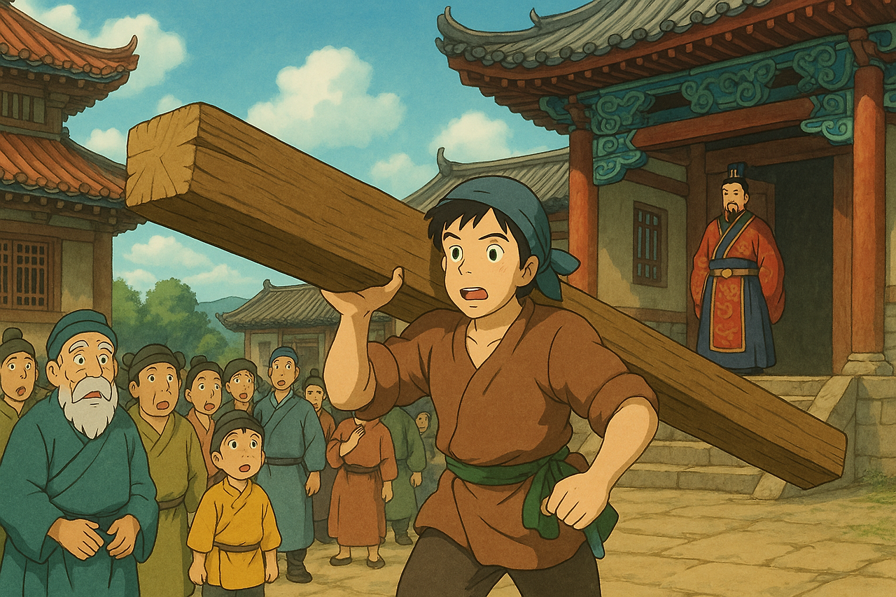 도성 남문 앞에 커다란 벽보가 붙었습니다. 그 옆에는 벽보의 내용처럼 긴 나무 기둥이 하나 서 있었습니다. 하지만 사람들 반응은 시큰둥했습니다. 금전 10개라는 큰 보상에 비해, 해야 할 일은 너무 쉬웠기 때문입니다.행여나 다른 의도가 있는 건 아닌지 의심하는 사람도 있었습니다. 하루가 지나고 다음날 아침에도 나무 기둥은 그 자리에 서 있었습니다.