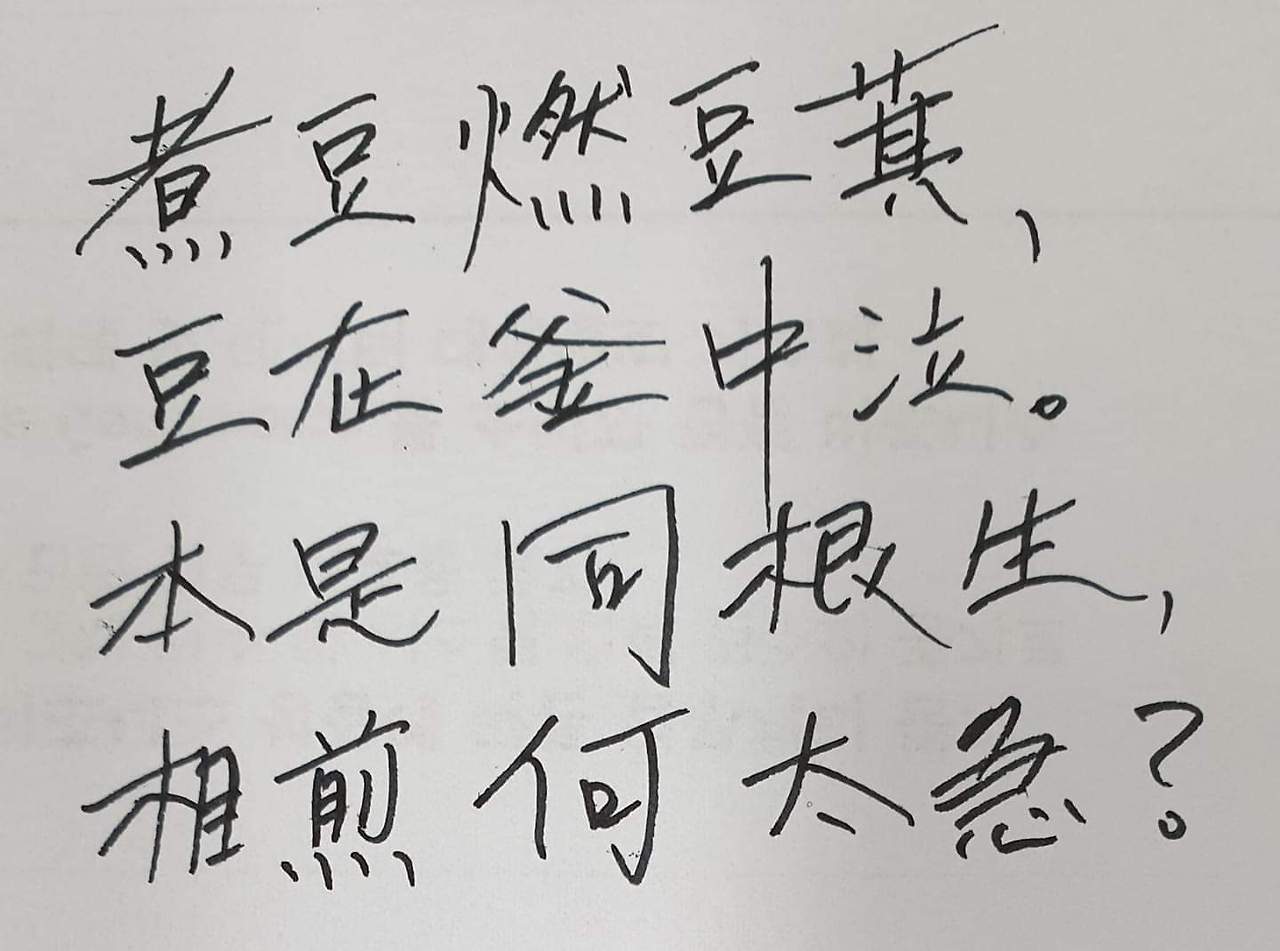 깍지를 태워 콩을 삶으니 콩이 솥 안에서 우는구나. 본디 한 뿌리에서 자랐건만 왜 서로 들볶아야만 하는지.
