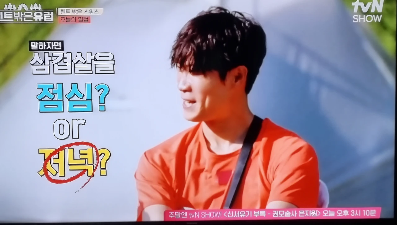 선배인 유해진이 저녁에 먹자 또는 점심에 먹자라고 먼저 이야기 할 수도 있지만 후배들에게 삼겸살을 점심에 먹을지 저녁에 먹을지를 묻어 본다.