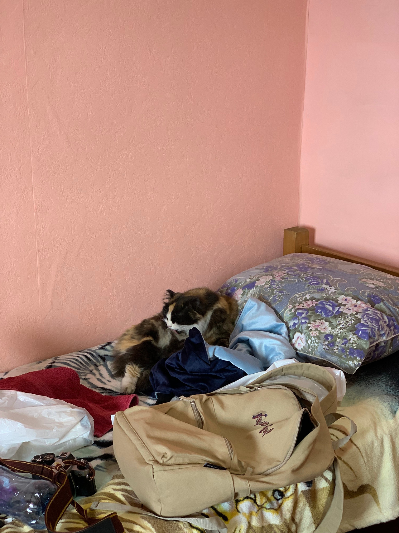 고양이님이 내가 숙소 문을 여는 사이에 재빠르게 함께 들어와 내 침대를 차지하셨다.