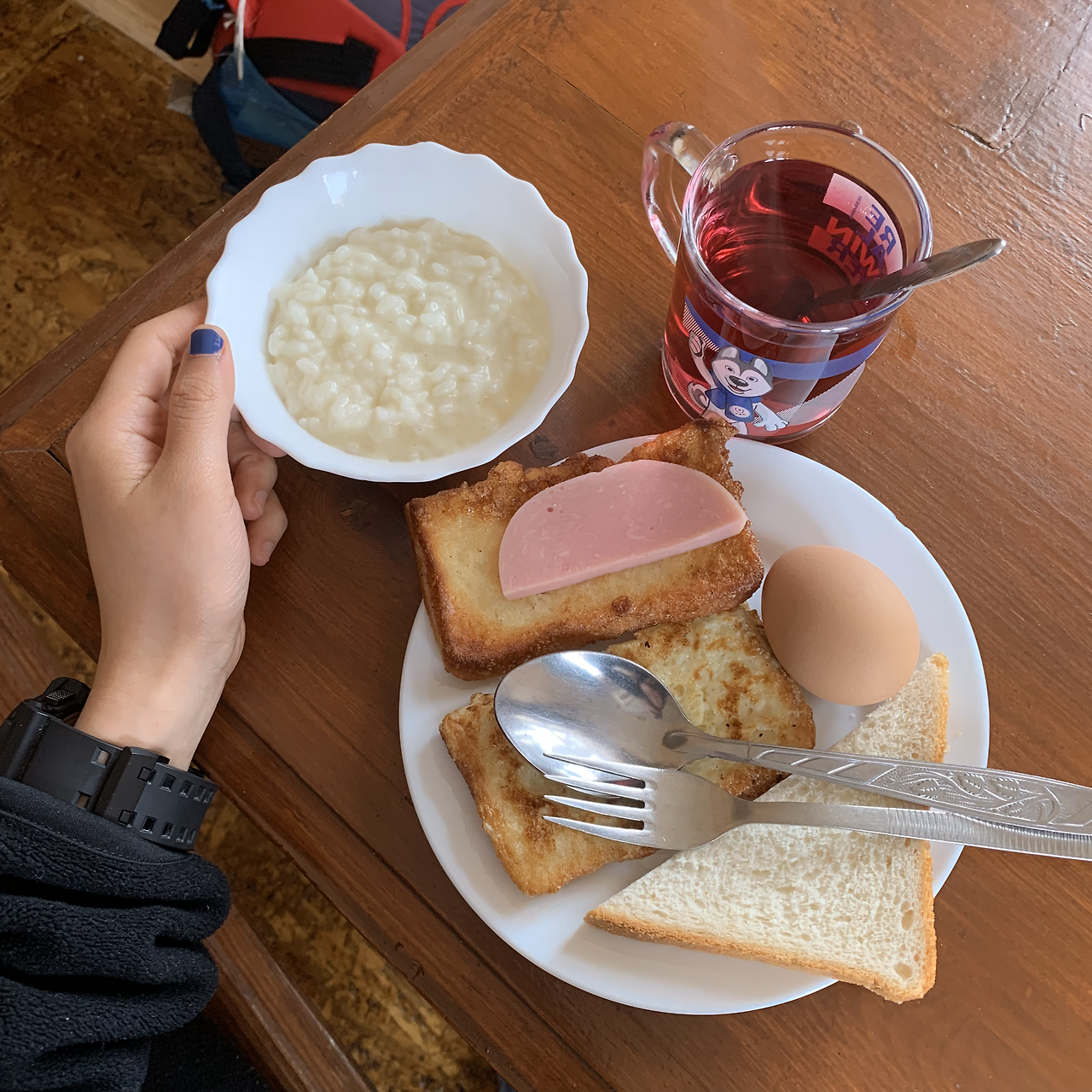 죽같이 생긴것은 달콤하고, 차는 상큼하고. 빵은 설탕과 계란을 적절히 섞어 달달하고 포슬포슬하니 맛있었고, 계란은 까보니 매우 부드러워 만족스러운 식사였다.