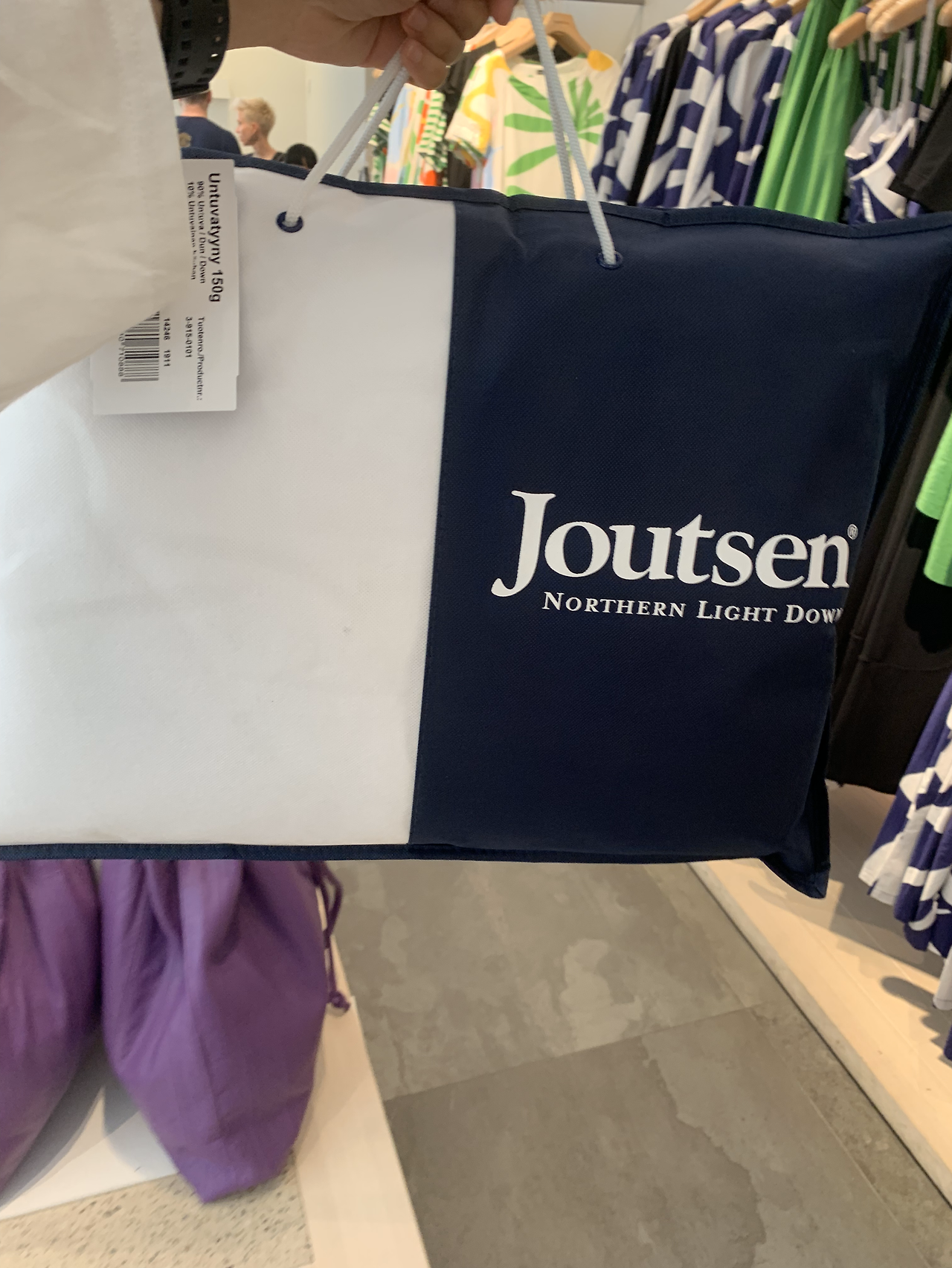 전날 수영장에서 찰박찰박 거린 덕분인지 평소보다도 더 늦게 일어났다. 토미가 가는 것도 못보고 정신없이 기절. 게다가 일어나서 뭐하지 하며 이불 속에서 뒹굴 거리다가 내가 여기서 푹 자는게 혹시 베개 덕인가 싶어 베갯잇을 벗겨 브랜드를 확인하고 검색하니 핀란드 브랜드라고 했다. “Joutsen” 이라는 브랜드로, 백조의 털로 만들어서 유명하다고 했다. 백조라니, 흥미가 생겨 쇼핑하러 가야지! 하고는 몸을 일으켜 나왔다.