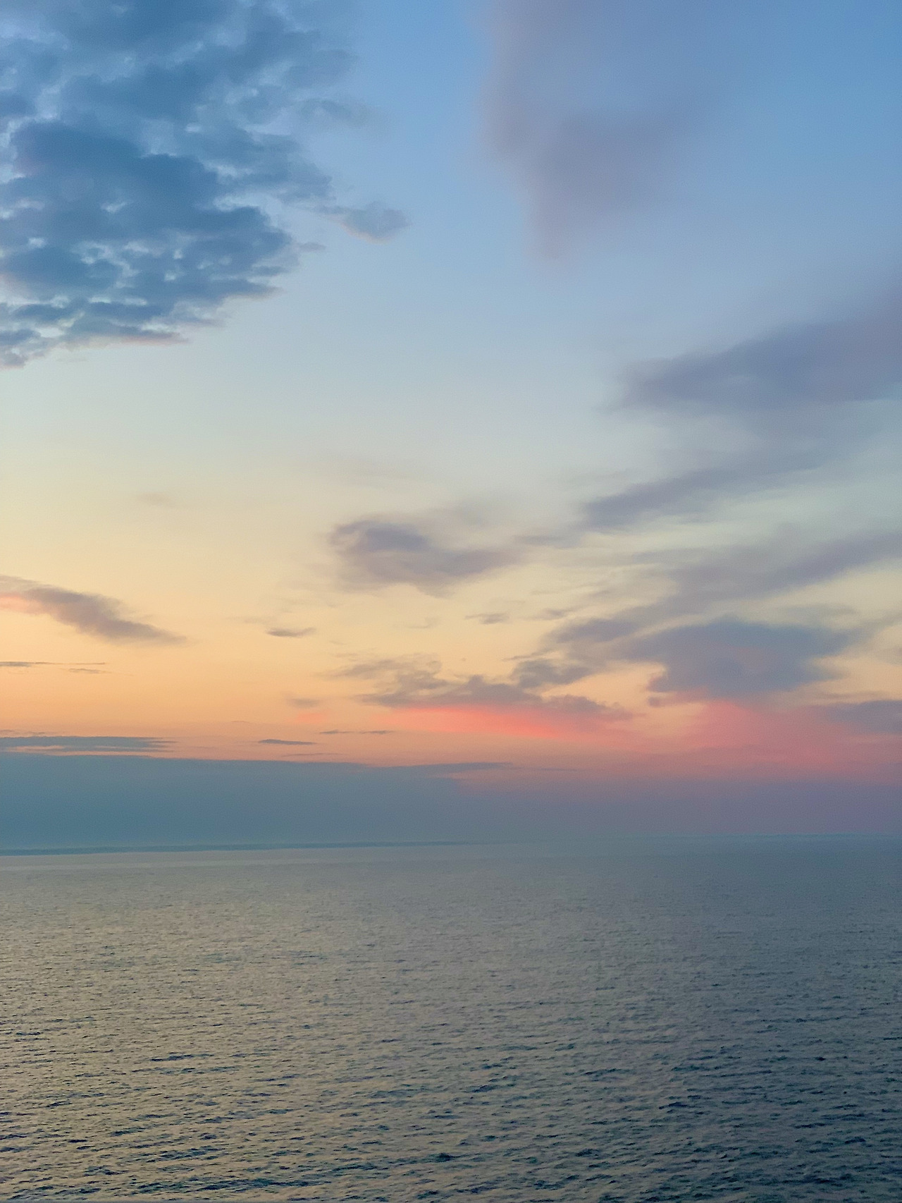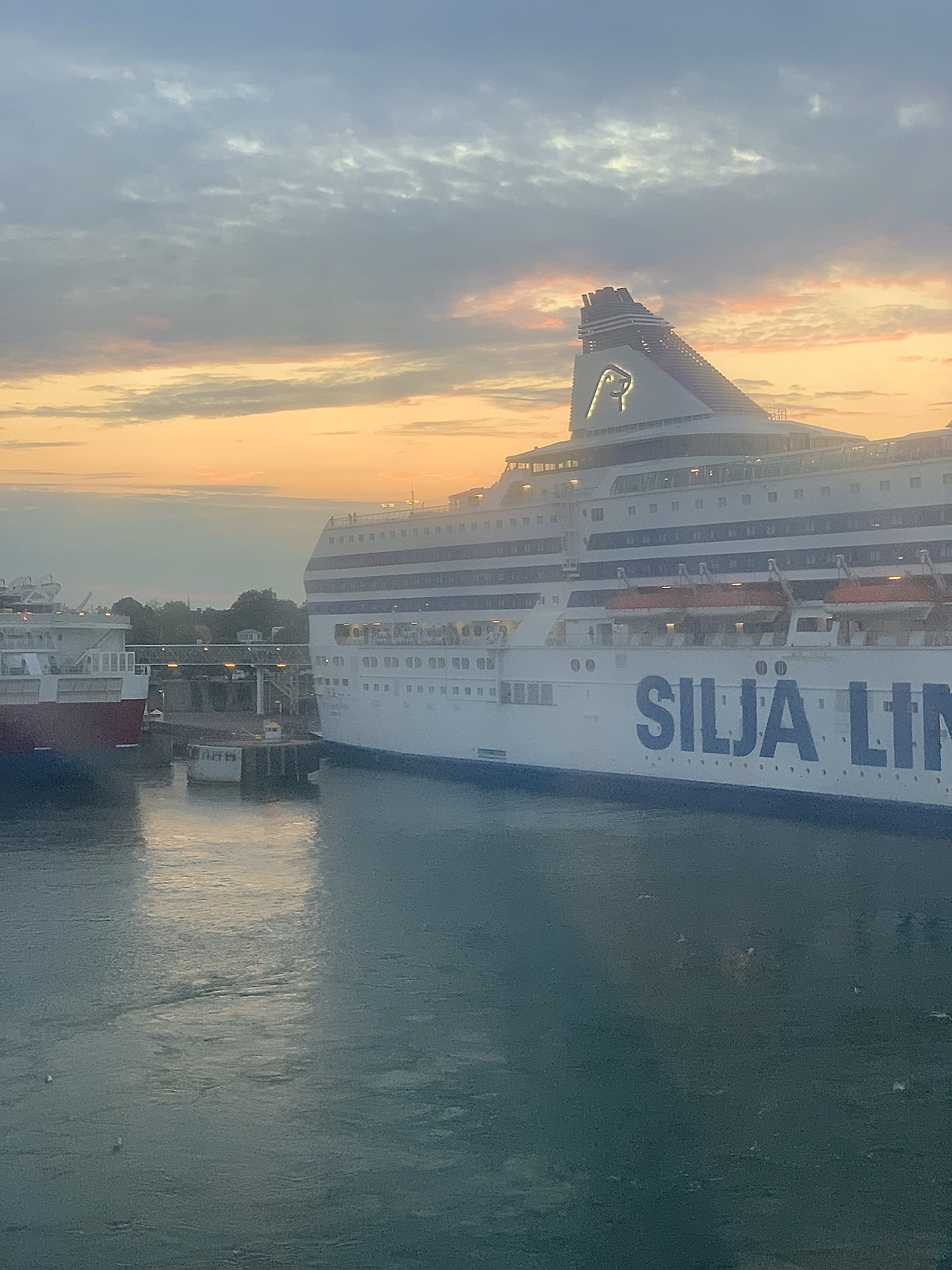백야라서 여행하는 내내 밝은 하늘만 보다가 이렇게 라벤더 색의 바다와 진한 코발트 블루의 발트해 색을 보게 되니 신기했다. 그리고 어스름하니 해가 떠 있는 것을 보고 엇 혹시? 하는 생각이 들어 반대편 갑판으로 호다닥 뛰어가봤다.