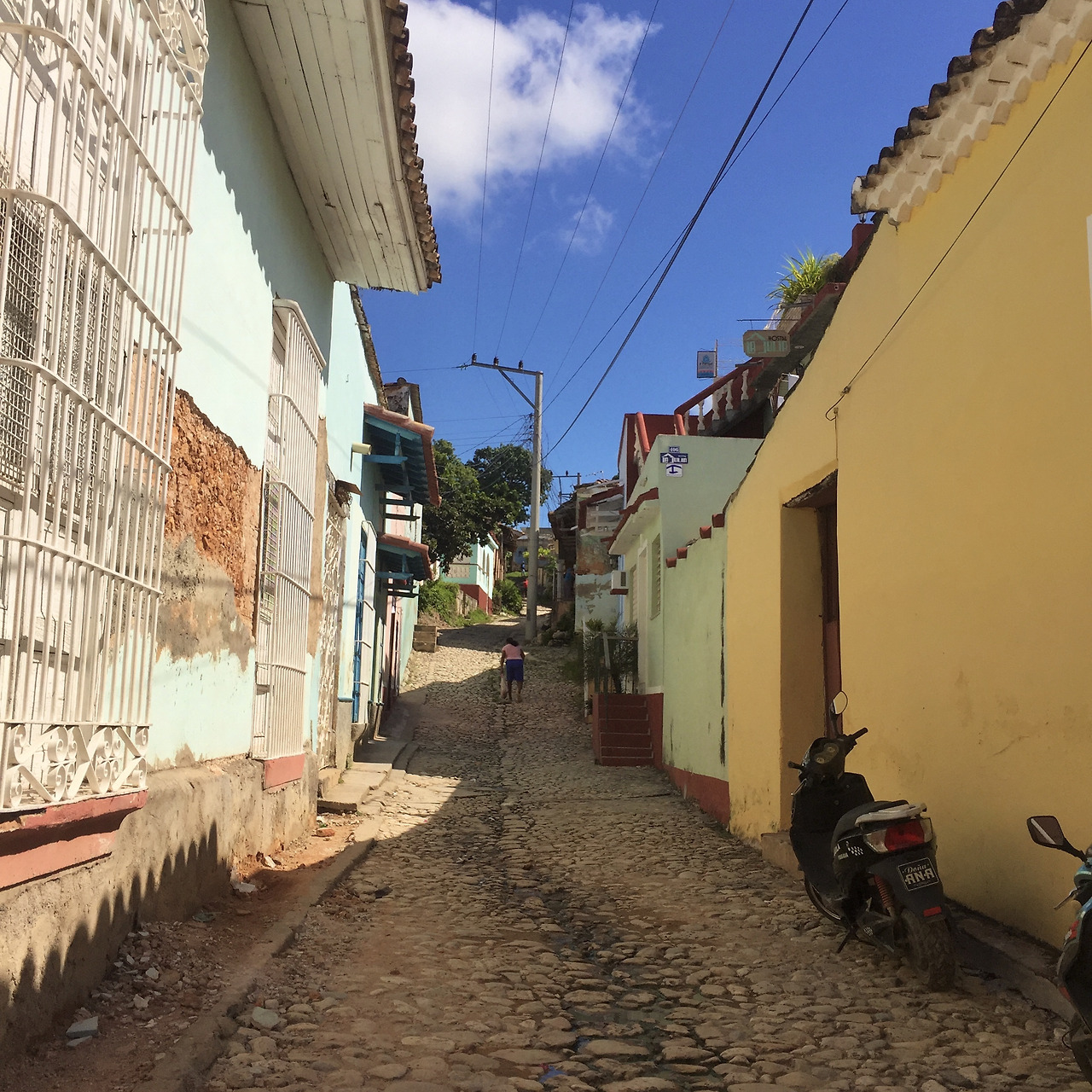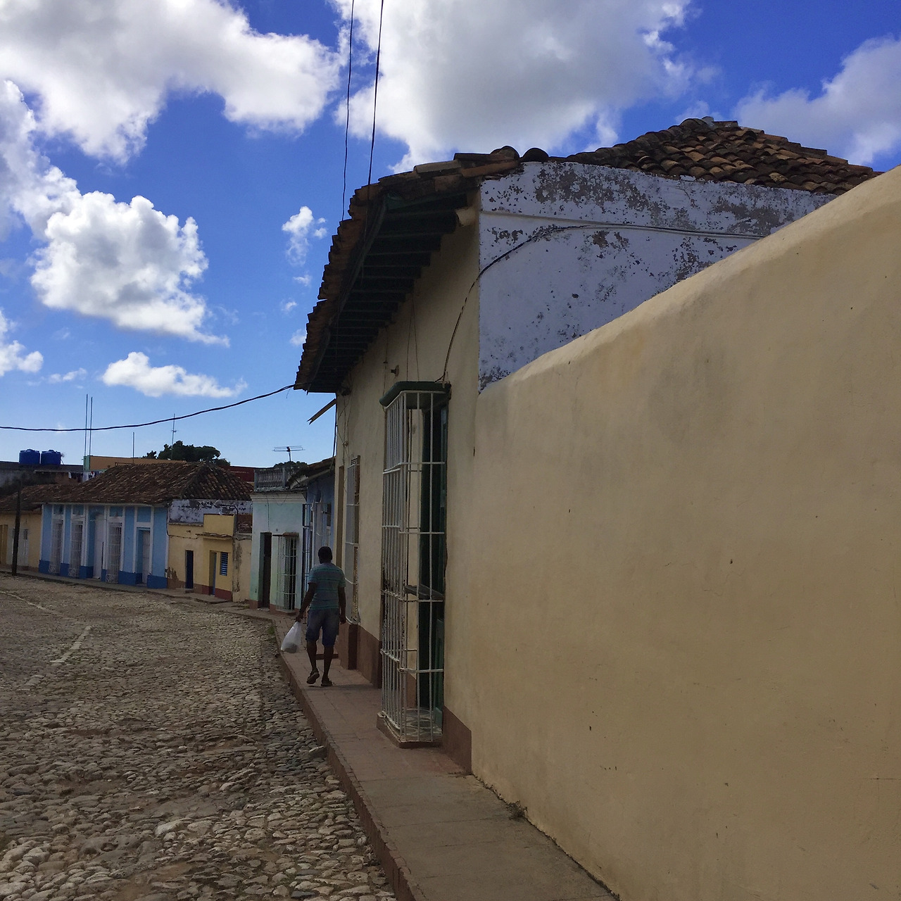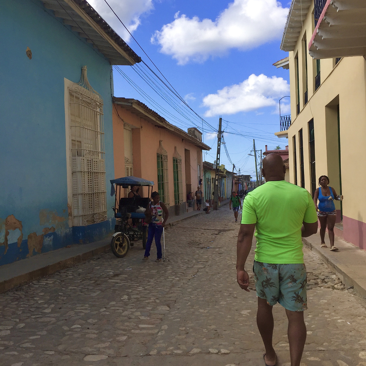 기념품으로 쿠바 국기가 그려진 팔찌와, 공산당스러운 (?) 군모 한 개를 산 후 수공예 시장을 나와 발이 닿는대로 계속 걸었다. 전날 일행들과 이리저리 신기해 하며 돌아본 것과는 또 다른 트리니다드의 매력이 골목마다 펼쳐졌다. 그것이 그렇게 재미었다. 눈 돌리는 곳 마다 색감이 살아 숨쉬며 말을 걸었고, 이들의 삶이 우리에게 말을 거는 것 같았다. 곳곳에 보이는 자그마한 상점들, 크고 작은 돌이 빼곡한 길거리, 날이 더워 문을 열고 싶지만 불청객의 침입을 막고자하기 위한 철창. 하지만 그들의 의도와는 달리 스스로를 가둔 것 처럼 보이는 철창까지. 그들의 삶이 우리가 지나가는 골목마다 넘살거리며 말을 걸었다.