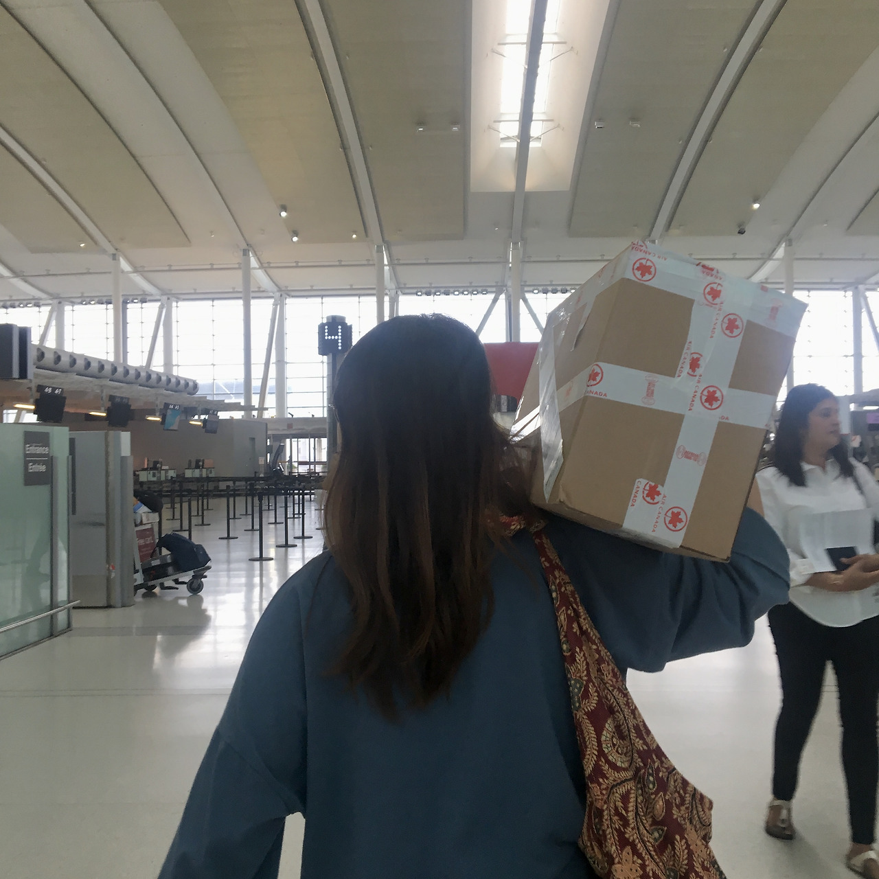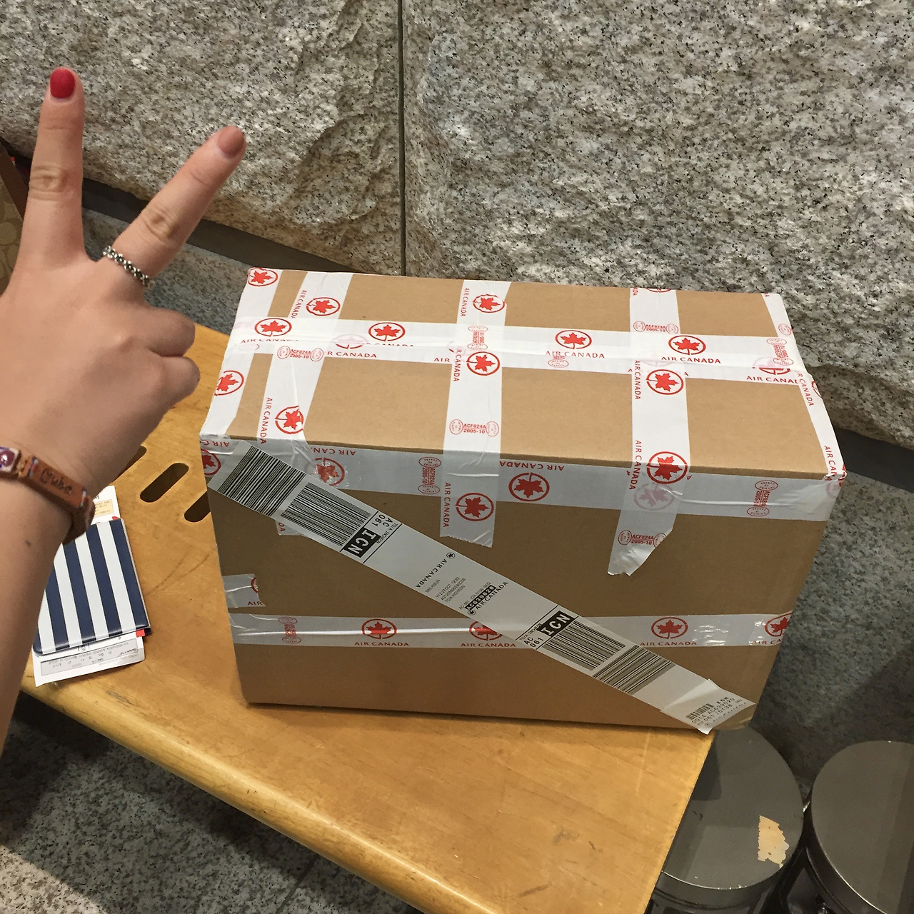 우여곡절 끝에 피어슨 공항 내부를 한바퀴 죄다 돌아보고, 에어캐나다 카운터에까지 가서 줄을 서자 내 얘기가 다 퍼졌는지 누군가가 상자를 갖고 나타났다. 혹시 술이 깨질까 걱정되어 다이어리 속지를 찢어 말고, 겉옷을 둘둘 말아 상자에까지 넣으며 치밀하게 (?) 포장하고 나니 실실 웃음이 났다.