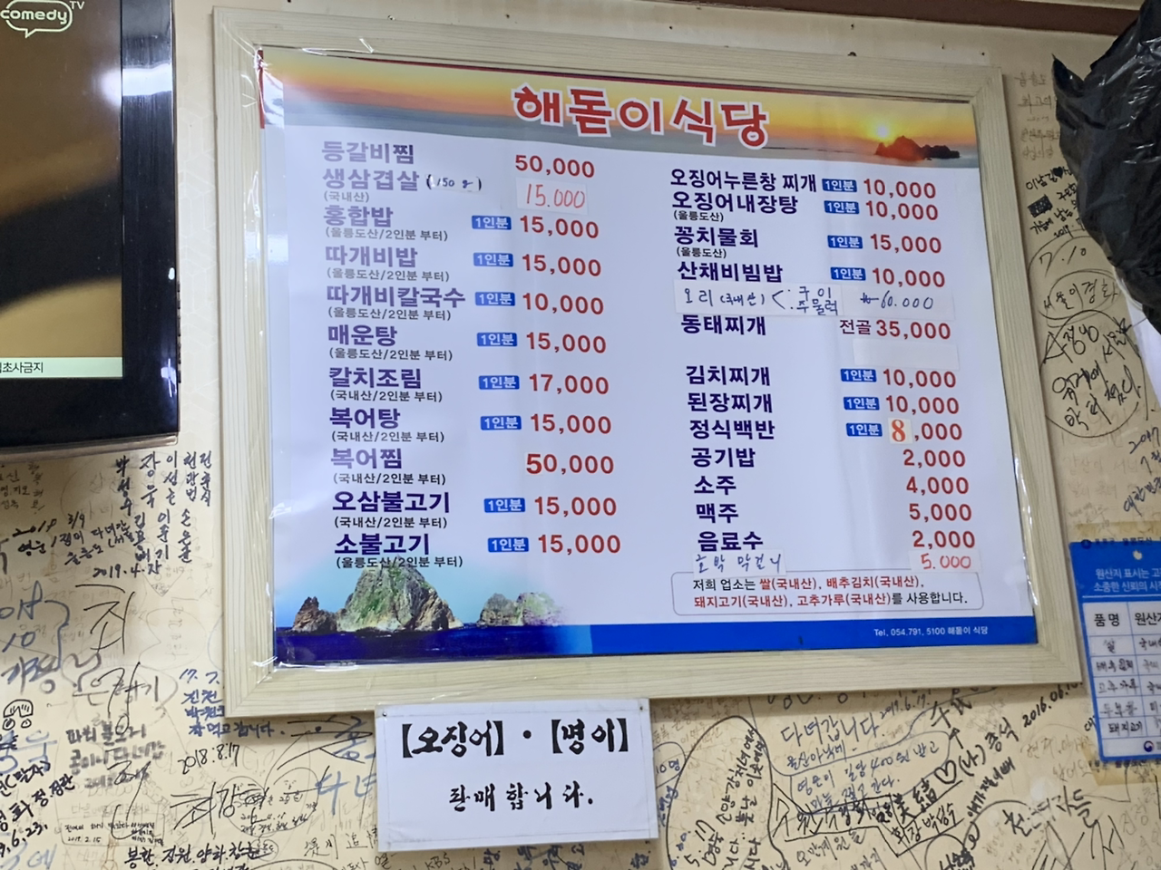 밥 때를 지난지 한참 되는 오후 3시의 식당에 손님은 나 뿐이었다. 가게 벽 곳곳에 손님들이 남긴 낙서가 가득했다. 그 날짜들이 제각각이지만 많은 이들이 등산 동호회 사람들, 스쿠버 다이빙을 하다 간다는 글을 보니 울릉도에 놀러 오는 사람들의 주 목적이 뭔지도 알 것 같았다.