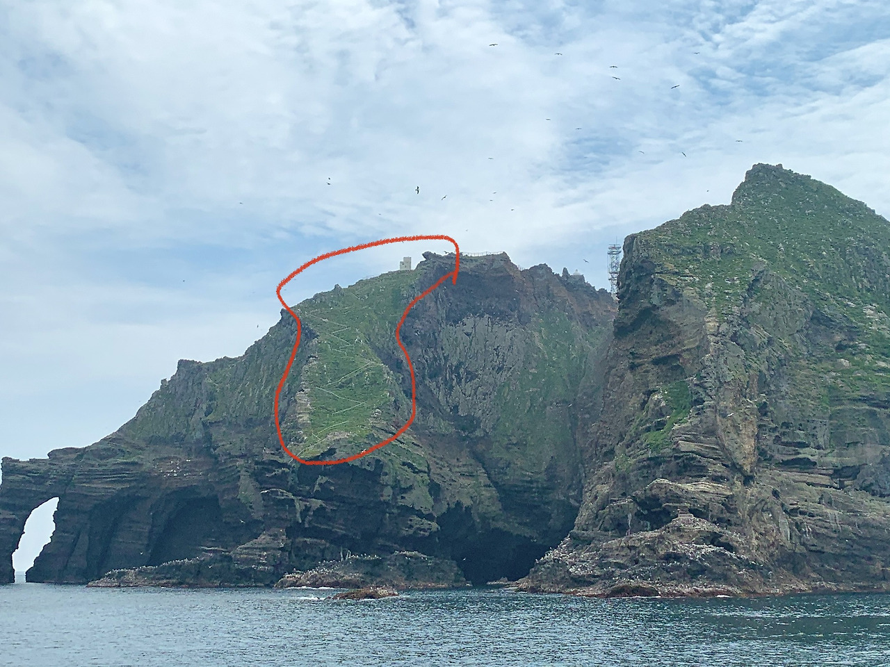 선원들이 갈매기에게 먹이 주지 말라는 소리를 함에도 불구하고, 갈매기는 배가 보이자마자 사람들에게 끊임없이 다가왔다. 저 멀리 보이는 독도, 그리고 갈매기가 끊임없이 날아다니는 섬. 그 둘을 보고 있자니, 독도는 우리땅 노래가 원래도 고증을 잘 한것임은 알고 있었지만 “외로운 섬하나 새들의 고향”이라는 가사는 상당히 고증이 뭐야 그냥 눈 앞에 갖다 그려준 수준이었다. 그렇게 갈매기가 끊임없이 날아다니는 독도를 멀리서 보고있자니, 배가 어느새 섬을 한바퀴돌았는지, 누군가가 어 한반도 바위다! 라고 외쳤다. 모두의 눈이 쏠렸다.
