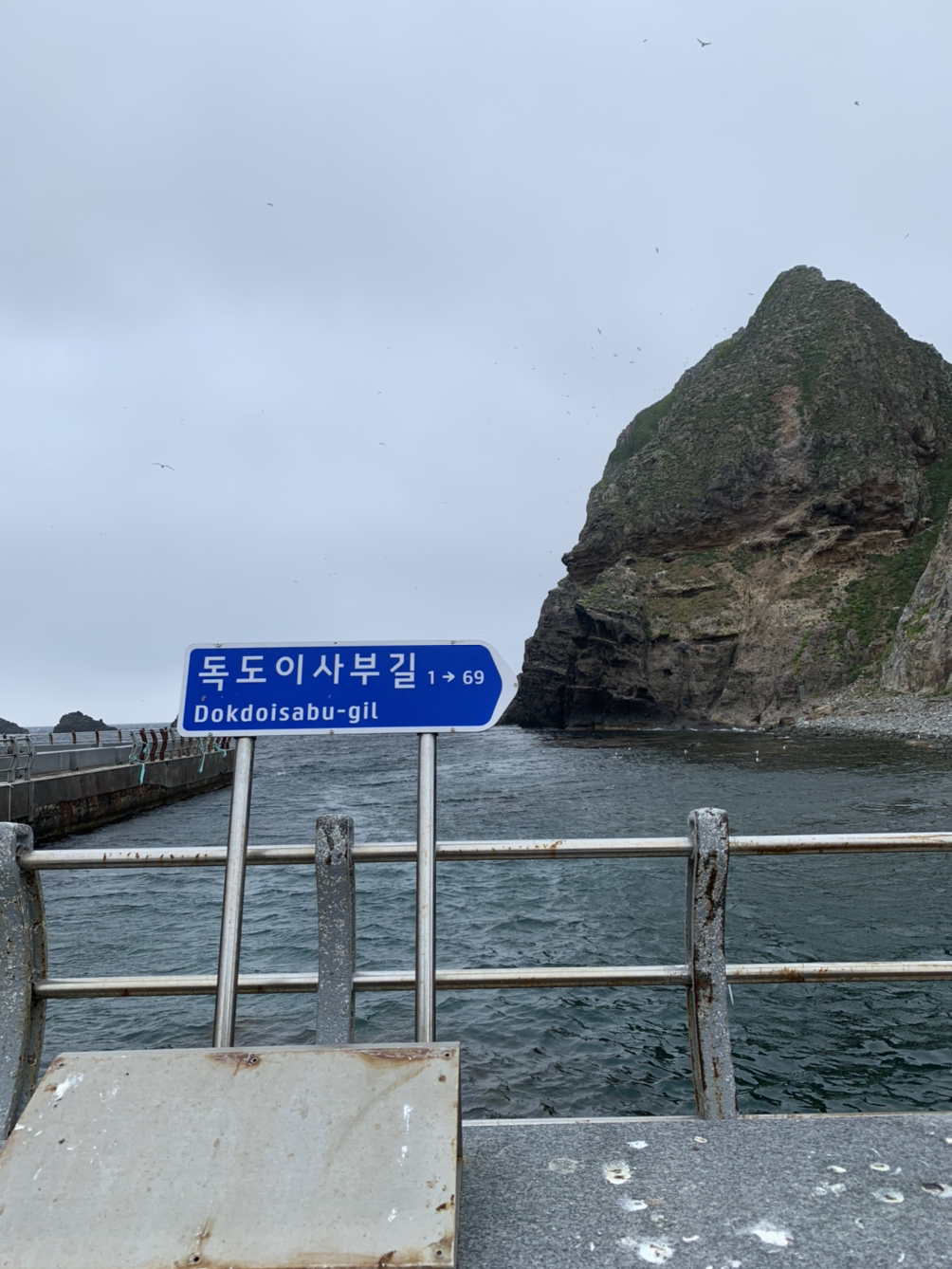 독도를 한바퀴 돌아보고, 이곳 저곳을 걸어다니다 보니 매서운 바람 때문인지 많은 사람들이 다시 배로 들어가서 조금은 선착장 주변에도 여유가 찾아왔다. 그 사이에 여기저기 눈과 고개를 돌리며 무엇을 볼지 생각하고 있자니 독도의 또 다른 사진 스팟인 독도 이사부길 표지판이 보였다. 여기서 사진 또 찍어야지 하며 게스트하우스에서 온 사람들과 줄을 섰다. 다들 얼마나 독도에 들어와 설레는지 얘기하다 독도에 들어오는 시그널이 독도 수비대 위문품 사라는 방송인것 같다고 말하자 당진에서 온 언니가 사실 자기가 배에 탔을 때 해군 복장을 한 사람이 함께 탔다고 했다. 그리고 배에서 내려 독도 수비대 쪽으로 갔다고. 아마도 교대하는건 아니었을까? 라는 많은 추측들을 했다. 그 사이에, 이사부길에서 사진 찍을 차례가 되었다.