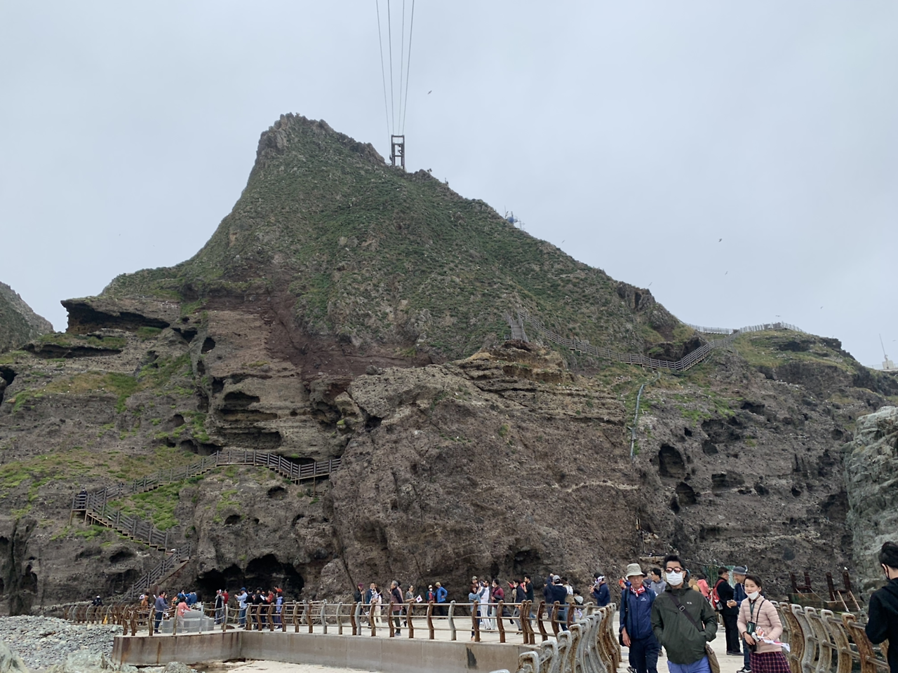 어느새 섬 저 안쪽에 있던 사람들도 배에 도착하여 배에 오르기 시작했다. 선착장에 남는 사람들이 없는 것을 보고는 우리도 배에 오르기로 하고는 배쪽으로 가는데 발이 안떨어지고 고개는 자꾸만 뒤로 돌아갔다. 이곳에 더 있고싶다, 하룻밤 자고싶다 라는 것 보다는 정말 이제 보면 언제 다시보나라는 감정이었다. 배에 타며 보니 독도 수비대에게 줄 위문품이 케이블에 매달려 올라갈 준비를 하는게 보였다. 케이블 끝은 독도의 꼭대기까지 이어져있었다. 저 꼭대기까지 이 기구는 어떻게 설치했을까. 독도 위문품이 독도에 들어갈 수 있다는 시그널임을 알고나니 독도 위문품을 하나도 못보탰다는것이 새삼미안했다. 미안하니, 다음번에 올 때는 보탤 수 있도록 해야지. 그리고는 떨어지지 않는 발걸음을 억지로 떼어 배에 들어갔다.