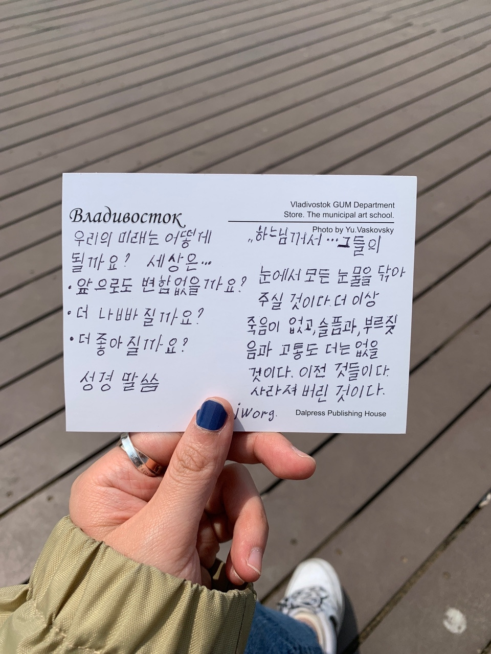 당황해서 아하...네에...잘쓰셨네요 하고 웃어주자 신기하게 눈치는 좋았던 러시아분은 혼란스러움과 쓸데없이 잘 쓴 한국어 엽서를 주고 사라졌고, 이 황당한 상황에 배가 더 고파진 나는 그냥 식당에 가서 밥을 먹기로 했다.