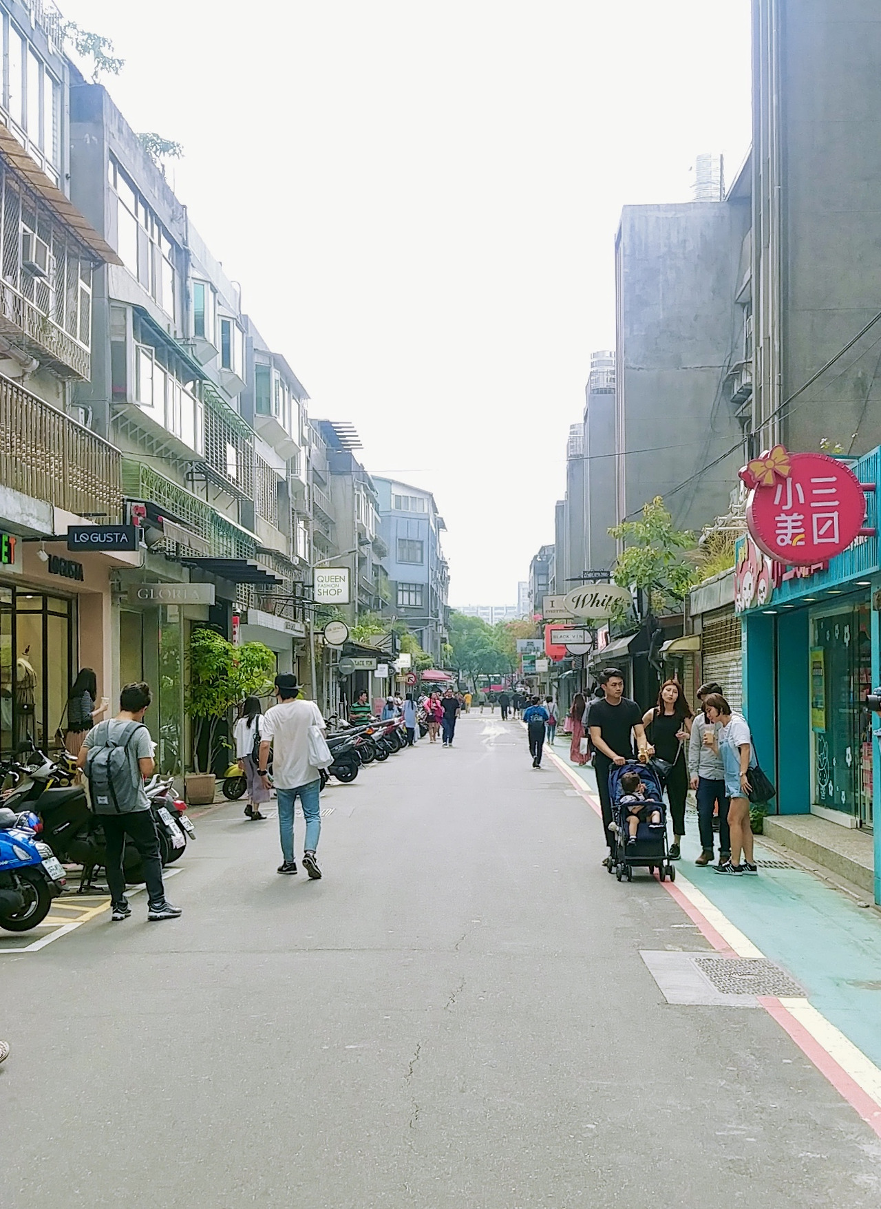 이 길을 자전거를 타고지나가며 어? 대만에 이런 곳도 있구나? 라는 감상을 하며 지나갔다. 양 옆으로 늘어선 옷가게, 예쁜 카페, 소품샵 등이 내가 밟는 페달에 따라 스쳐지나갔다. 골목 안쪽이라 간혹 차가 지나다니긴 했지만, 길도 넓은데다가 대만 특유의 청량한 느낌과 내리쬐는 늦봄의 햇빛은 괜시리 그 길에 대해 설레임을 느끼게 만들었다.