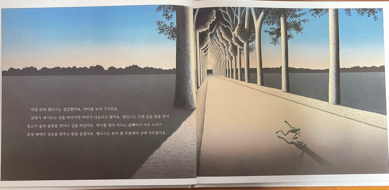 앨리스도 유리병의 도움을 받기 전에 자신의 마음의 근육이 튼튼했기에 좌절을, 실패를 계단삼아 용기를 내어 나아갔던 것입니다. 물론 성난 파도를 만나고 덩그러니 바다 한복판에서 울고 있으니 달그림자가 집에 데려다 주었지요. 하지만 앨리스는 다시 나아갈 힘을 키워 바다를 향해 나아가 수련 잎과 함께 파도타기를 멋지게 즐기게 되었습니다.
