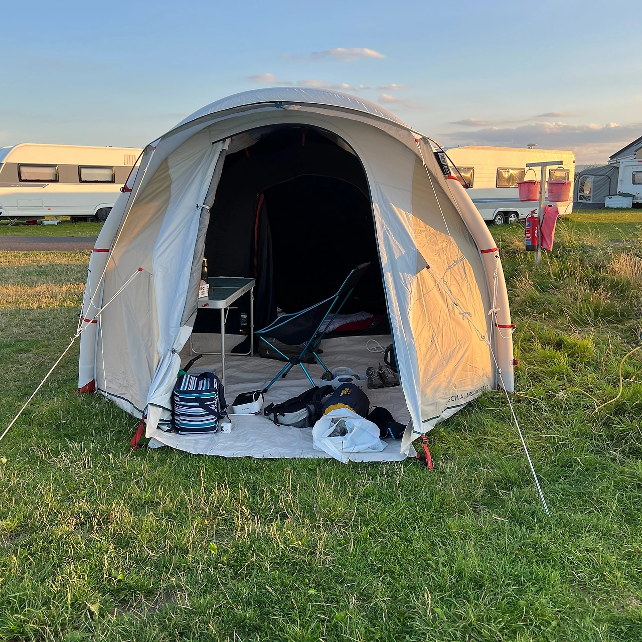 이 에어 텐트는 내부 공간이 넉넉하고, 설치도 편리하다. 단점이라면 무게가 20kg 정도로 다소 무겁지만, 어차피 자동차 캠핑을 한다면 큰 문제가 아니다. 나는 이 텐트를 할인받아 약 300유로(약 43만 원)에 구매했다. 기존 프리미엄 에어 텐트가 200만 원대였던 걸 생각하면, 훌륭한 가성비다. 이 텐트만으로도 캠핑에서의 귀차니즘이 상당히 해결되었고, 좁은 공간 문제도 해결되었다. 호스텔과는 비교도 안 될 정도로 넓고, 거실 역할을 하는 전실도 아주 크다.