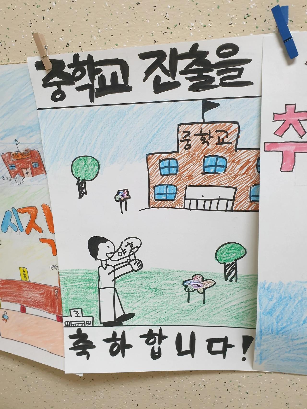 1학년 어린이들은 축하공연영상을 준비했고, 5학년 후배들은 포스터를 제작했네요. 그림솜씨가 전문 일러스트레이터 못지 않