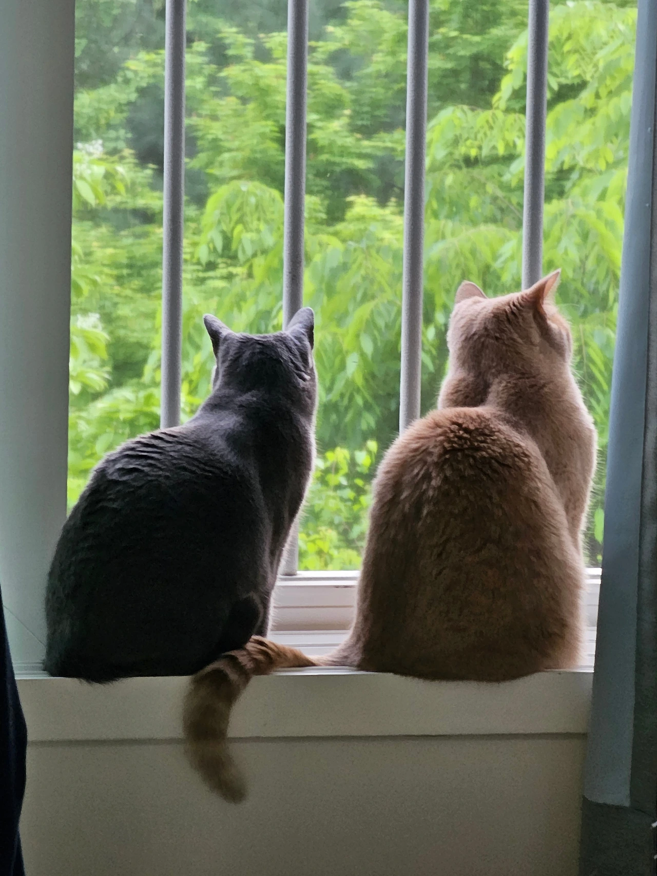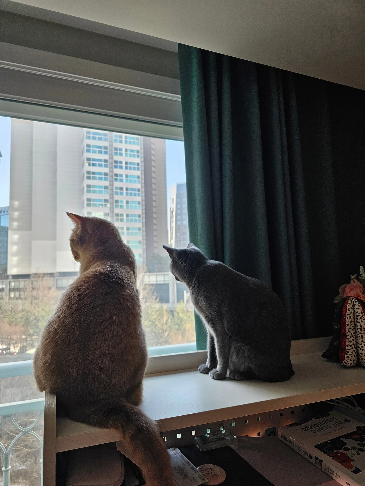 사이좋게 밖을 보아요. 바람이 시원해요.
