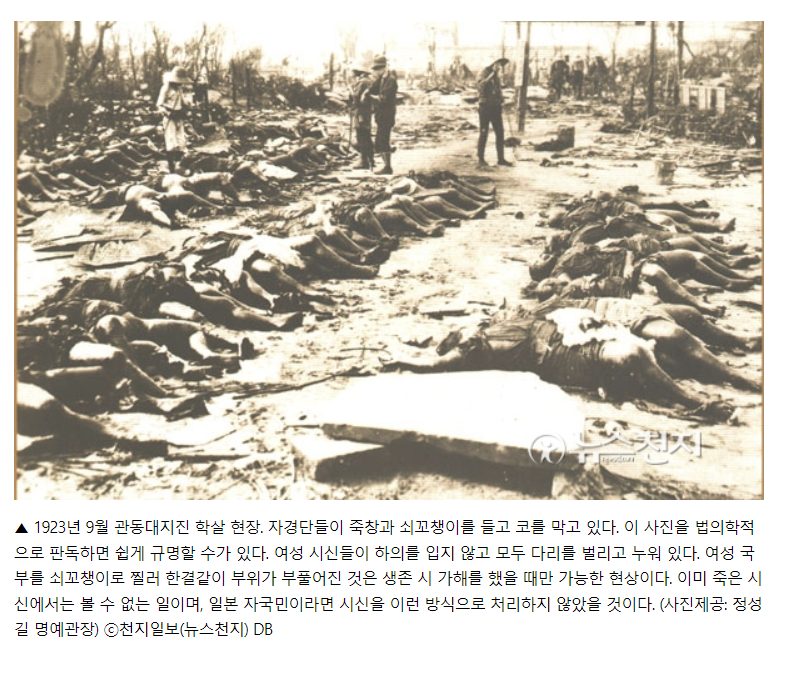 1923년 9월 1일 일본 간토·시즈오카(靜罔)·야마나시(山梨) 지방에서 일어난 대지진. 12만 가구의 집이 무너지고 45만 가구가 불탔으며, 사망자와 행방불명이 총 40만 명에 달했다. 다음날 출범한 제2차 야마모토(山本) 내각은 계엄령을 선포하고 사태 수습에 나섰으나 혼란이 더욱 심해져가자, 국민의 불만을 다른 데로 돌리기 위해 한국인과 사회주의자들이 폭동을 일으키려 한다는 소문을 조직적으로 퍼뜨렸다. 이에 격분한 일본인들은 자경단(自警團)을 조직, 관헌들과 함께 조선인을 무조건 체포·구타·학살했다. 이 사건으로 몇 명의 한국인이 학살당했는지는 확실치 않으나, 2천 명·3천 명·6천 명 등의 설이 있다. 일본이 이 진재에서 입은 총피해액은 65억 엔이라 하며, 그 후 이의 복구를 위해 노력했으나, 무고한 한국인을 수천 명씩이나 학살한 일본 군벌의 잔학행위는 역사상 씻을 수 없는 오점으로 남게 되었다.