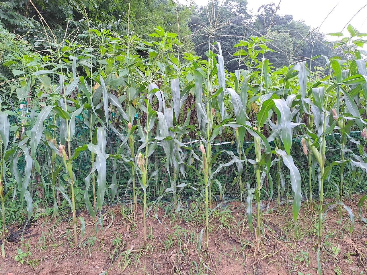 아들과 함께 재배 중인 텃밭 식물들이 장맛비에 쓰러지기도 하고 넘어지기도 했다. 하지만 큰 키임에도 불구하고 절대 쓰러지지 않는 강인한 녀석이 있었으니 바로 옥수수다. 옥수수는 척박한 땅에서 잘 자라고 가뭄을 잘 견디는 작물인 줄 알았는데 장마에도 강한 식물이었다. 키도 큰 녀석이 강풍에도 흔들림 없이 서 있는 모습이 늠름하다. 옥수수는 처음 키워 보는데 겨드랑이에 옥수수자루를 달고 있는 모양새가 가까이서 보니 신기하기도 하고 우습기도 했다.
