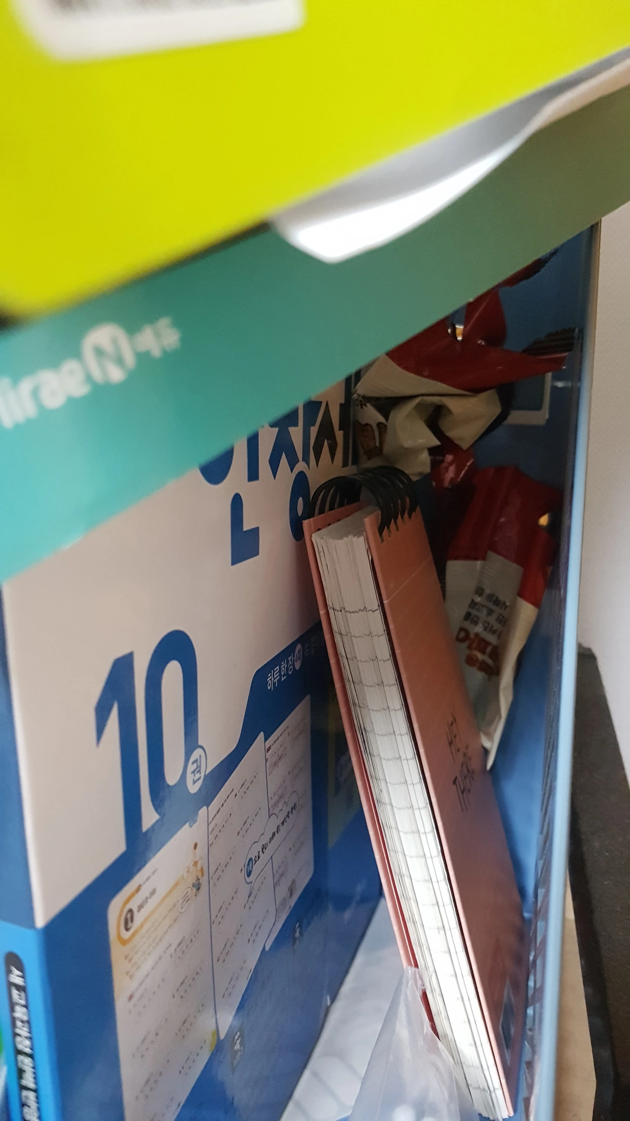 보였던 이유는 더 이상 뒤로 쓰레기가 넘어갈 공간이 없었기 때문이었다. 아들놈은 책 뒤편 공간을 알뜰하게 쓰레기통으로 사용하고 있었던 것이다.