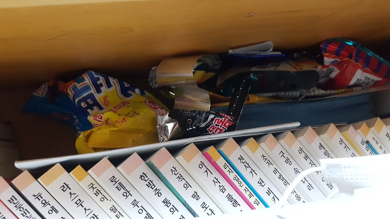 하지만 책을 찾기 위해 들어간 아들 책상에서 책 틈 사이로 무언가가 보인다. 책을 몇 권 더 뽑아보니 그 실체가 드러났다. 과자 봉지였다.