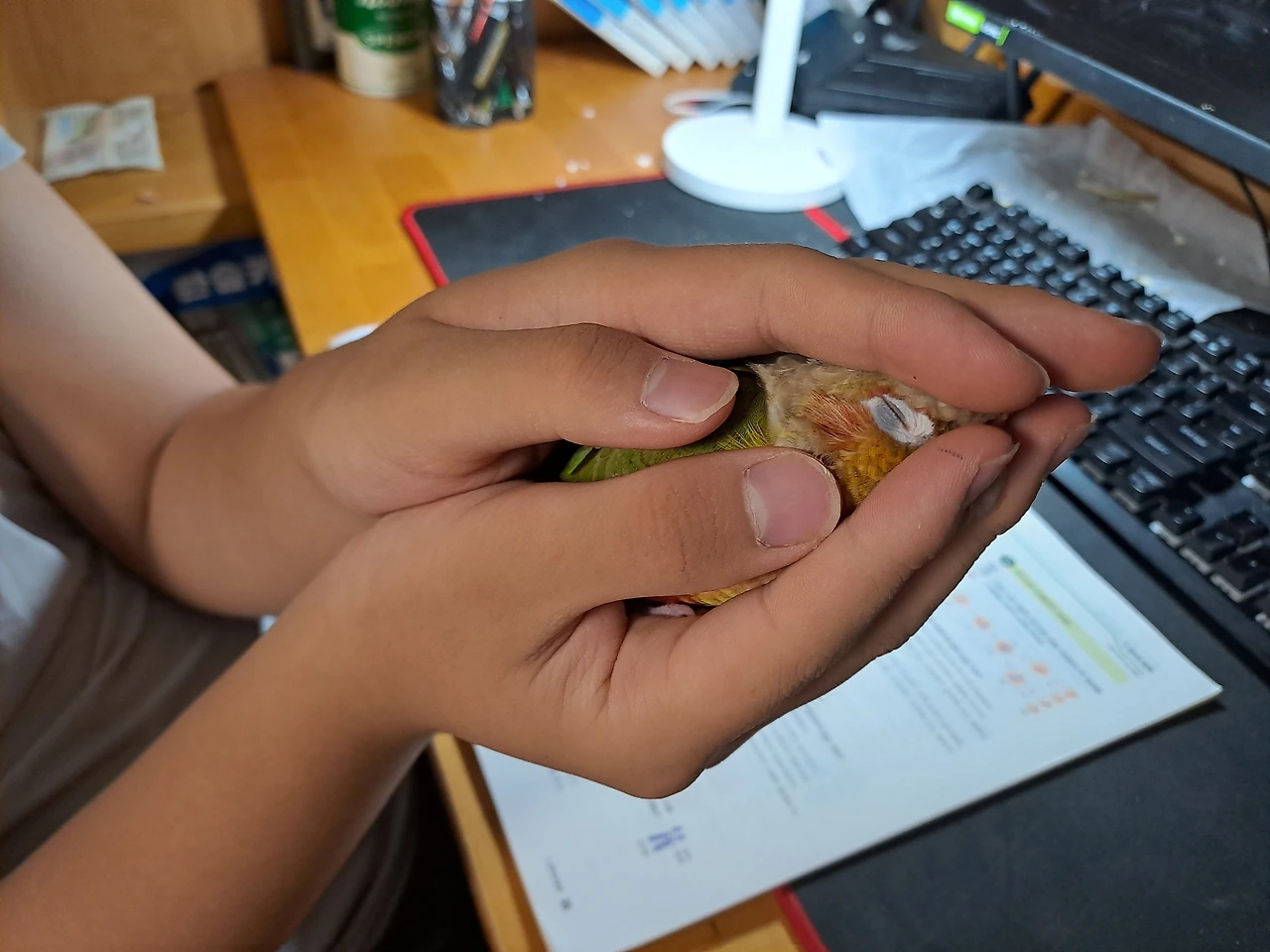 손안에 보들보들, 몽글몽글한 존재가 잠들어있다. 손을 움직일 수 없어서 불편하지만, 불편함을 감수할 만큼 행복감도 크다. 행복을 손으로 잡을 수 있다면 이런 느낌이 아닐까 싶을 정도로 기분이 좋다.새들은 길게 잠을 자지 않기 때문에 손가락에 쥐가 나더라도 충분히 기다려 줄 수 있다.