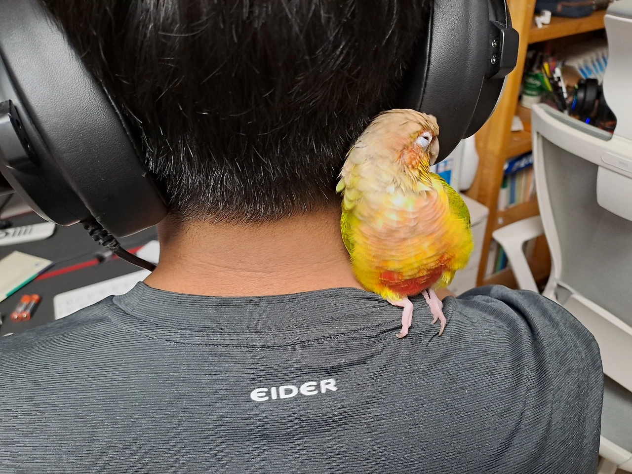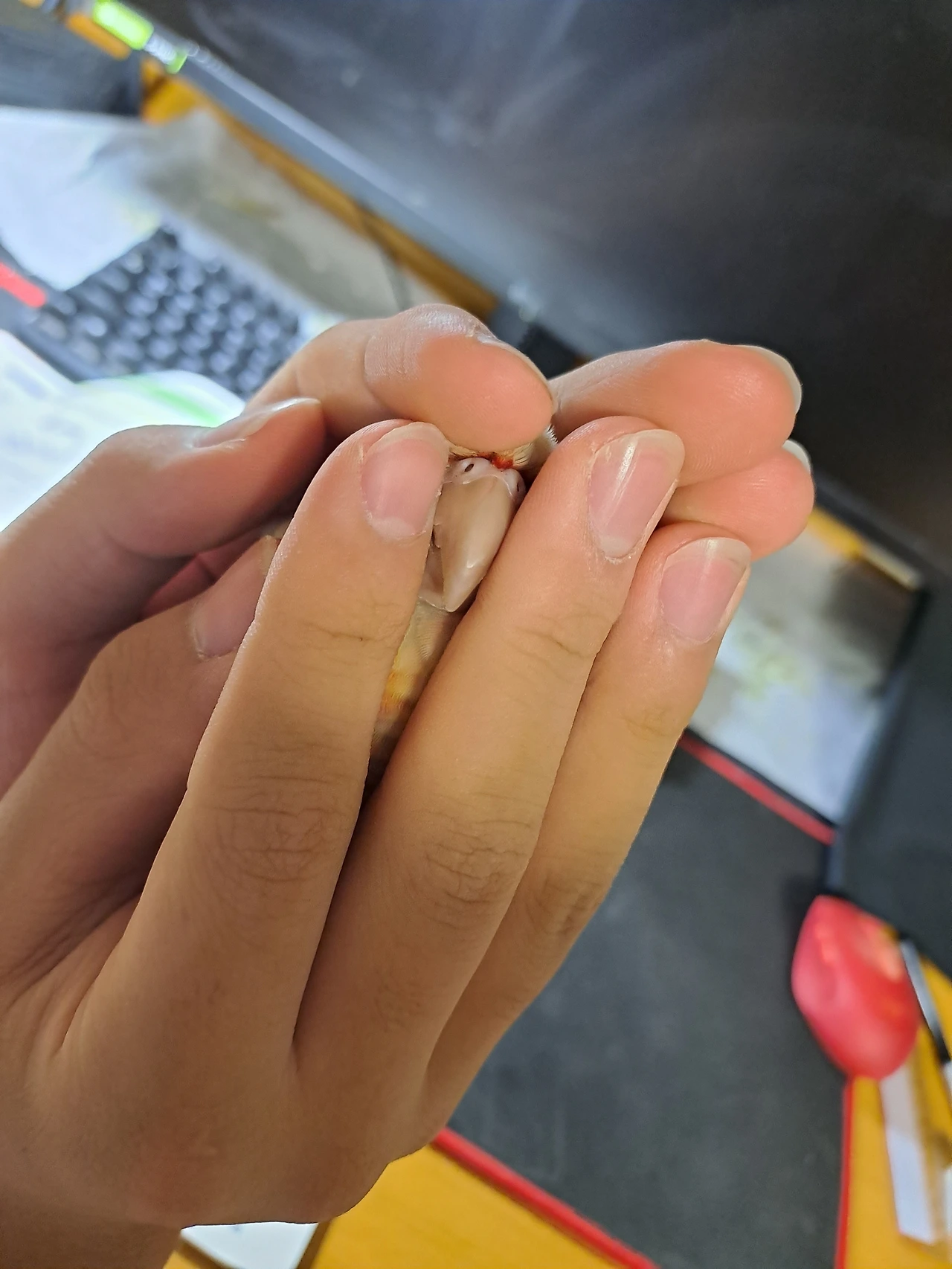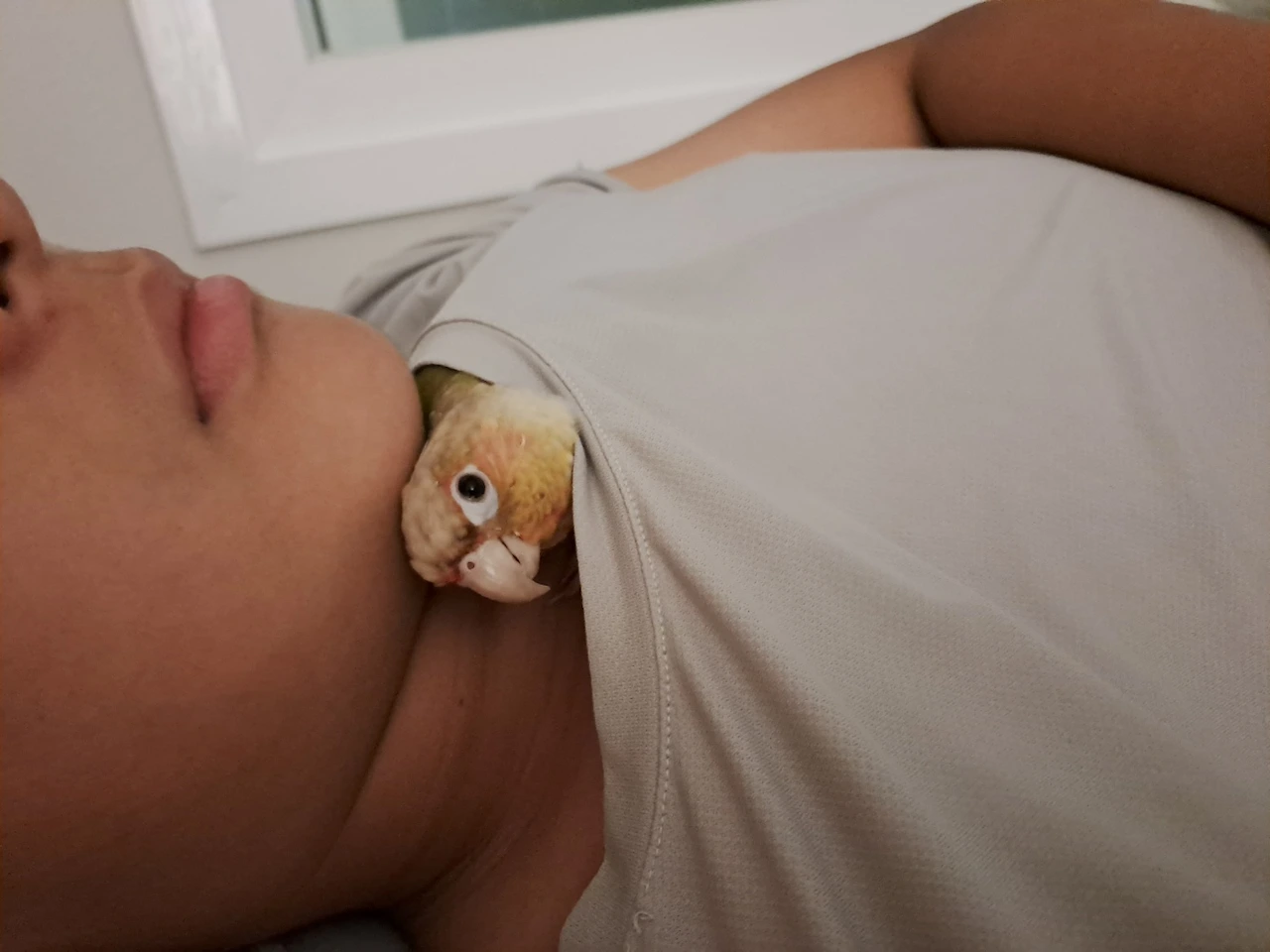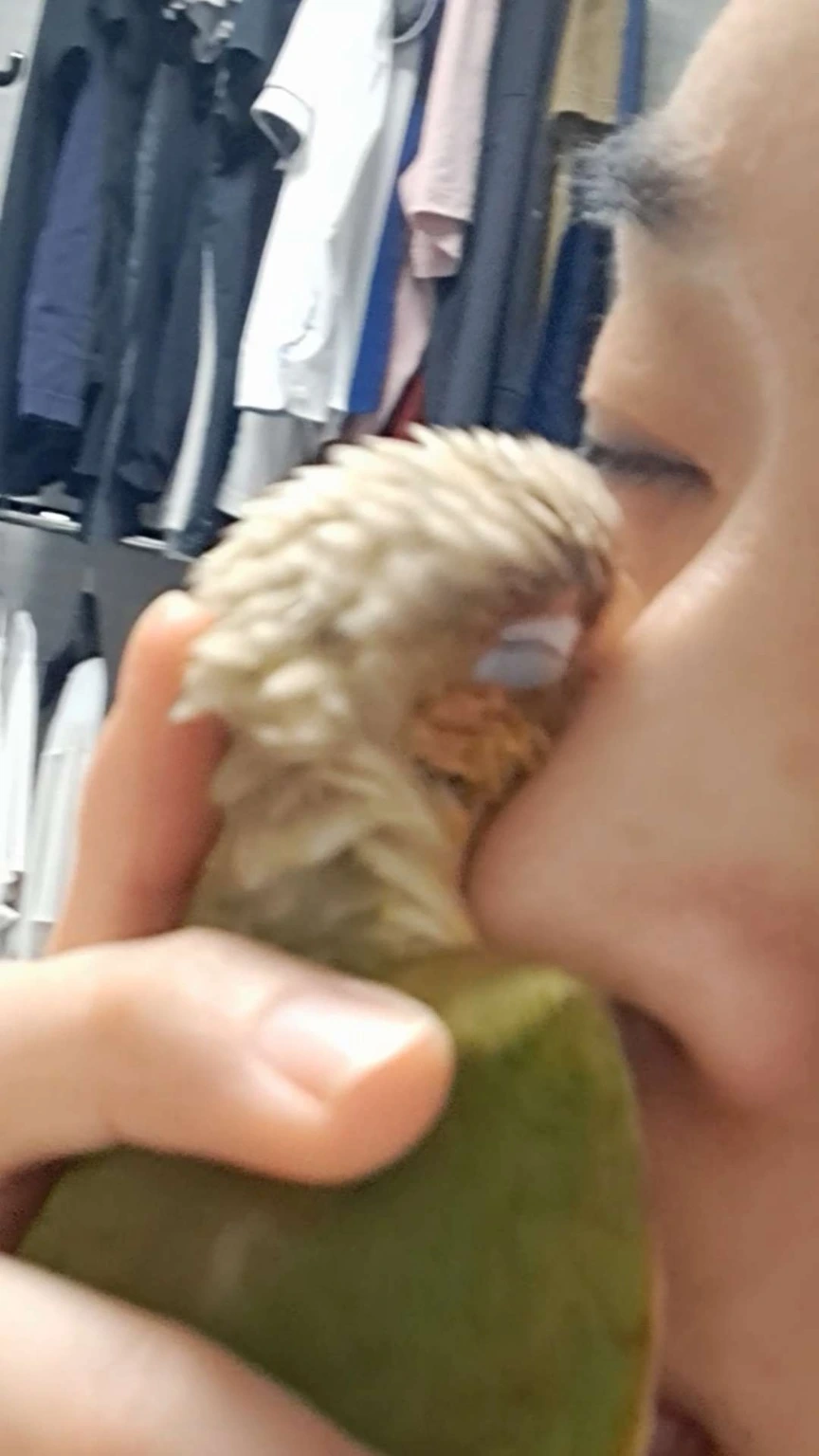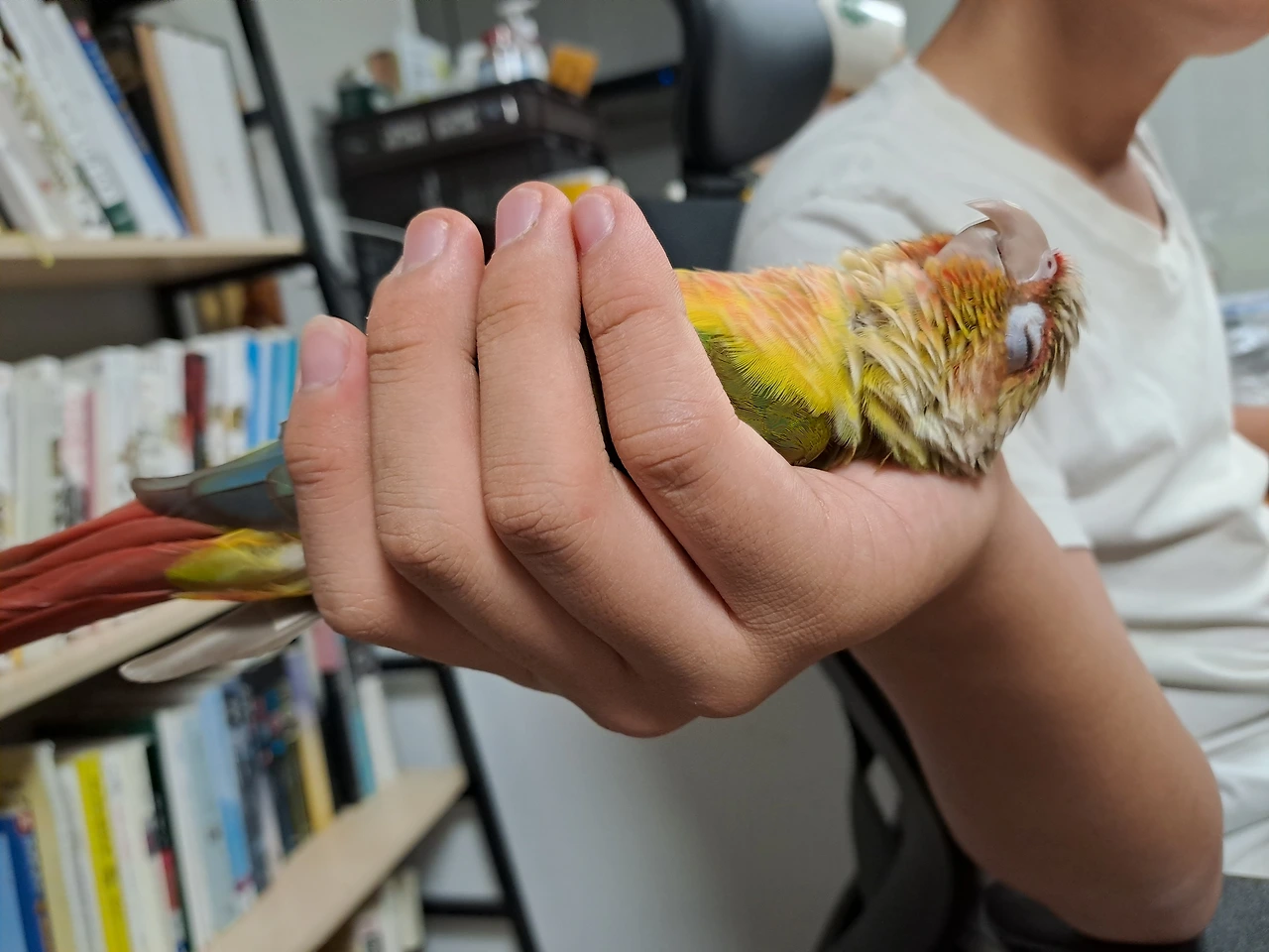 두 손 모아 기도하는 형세로 잠들었다. 세상에나 이렇게 사랑스럽게 자는 앵무새가 있을까? 숲 속에 잠자는 공주는 들어봤어도 손바닥 안에 잠자는 앵무새는 처음 보았을 것이다. 이불을 폭 덮고 자는 사람처럼 사람 손을 덮고 자는 앵순이!배려심 깊은앵집사라면 숨은 편안하게 쉬기 위해 부리는 꺼내주는 센스가 필요하다.